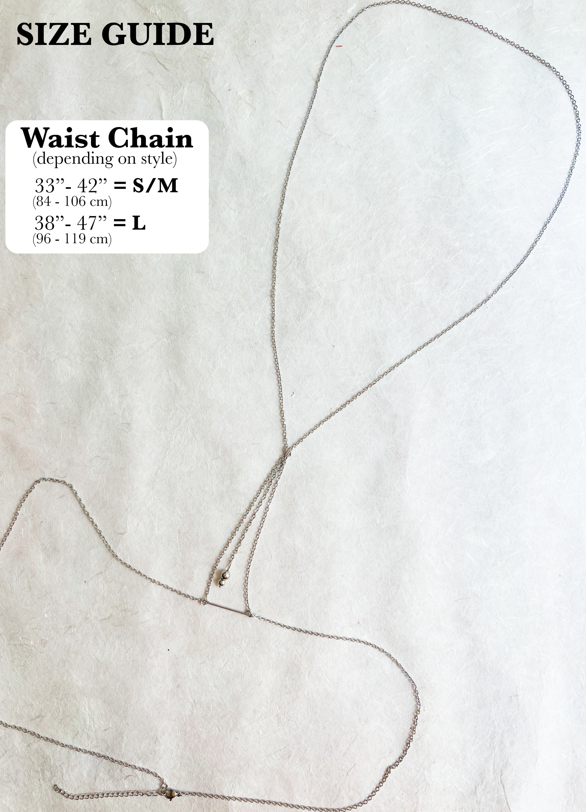 This design features only one clasp behind the waist and an adjustable "middle" part that can be tighter like a choker or hanging lower. Depending on how you want to wear it (if fully up or down it is tighter, if in the middle it is wider) the waist chain length ranges quite a bit: