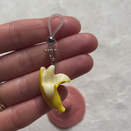Cute fake nipple noose piercing with banana charms and silver colored stainless steel beads, by Secretly Mine.