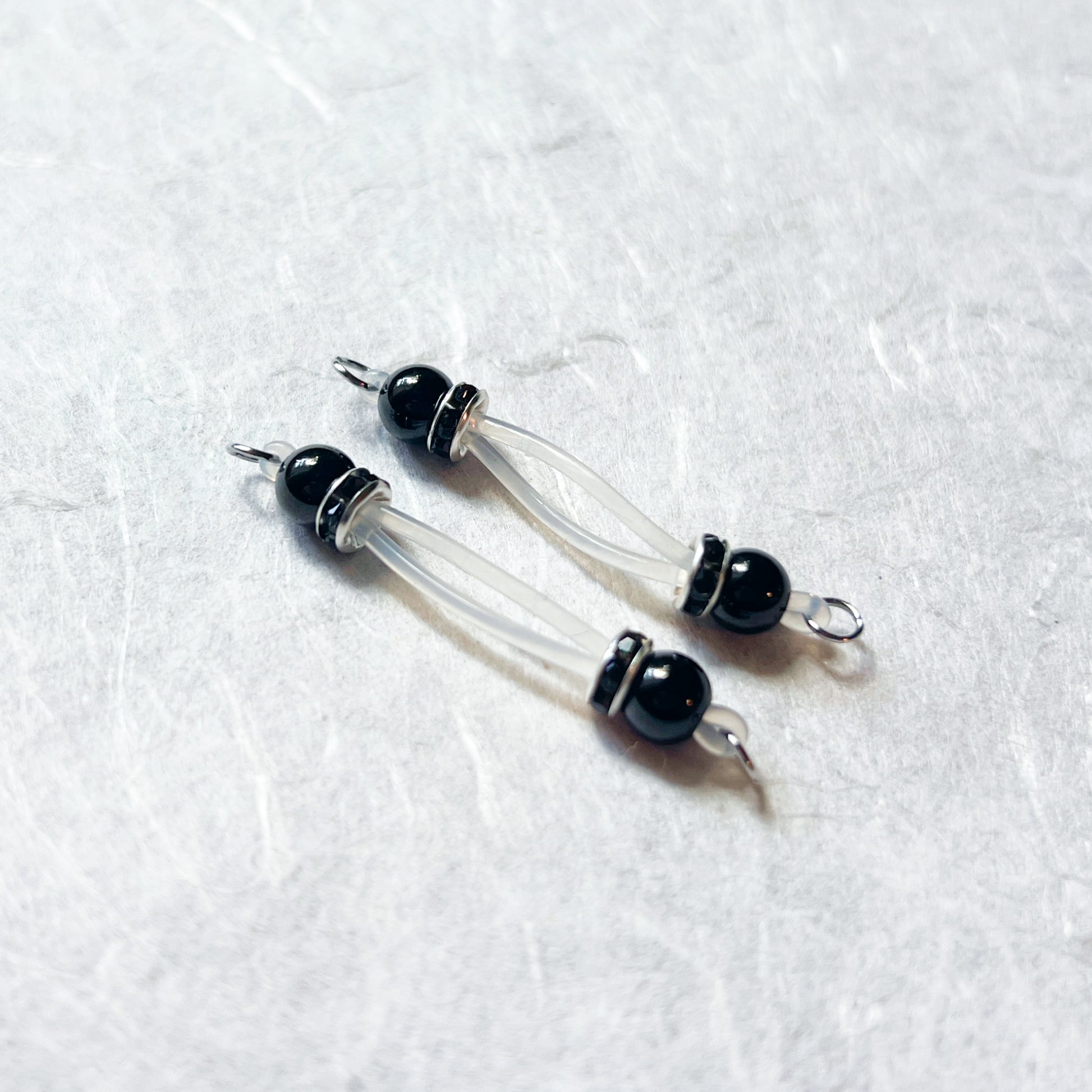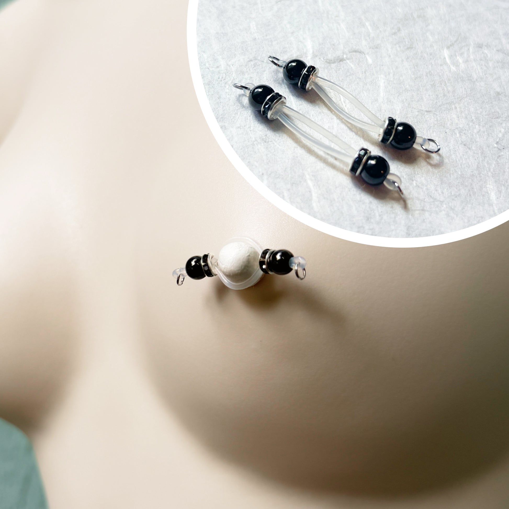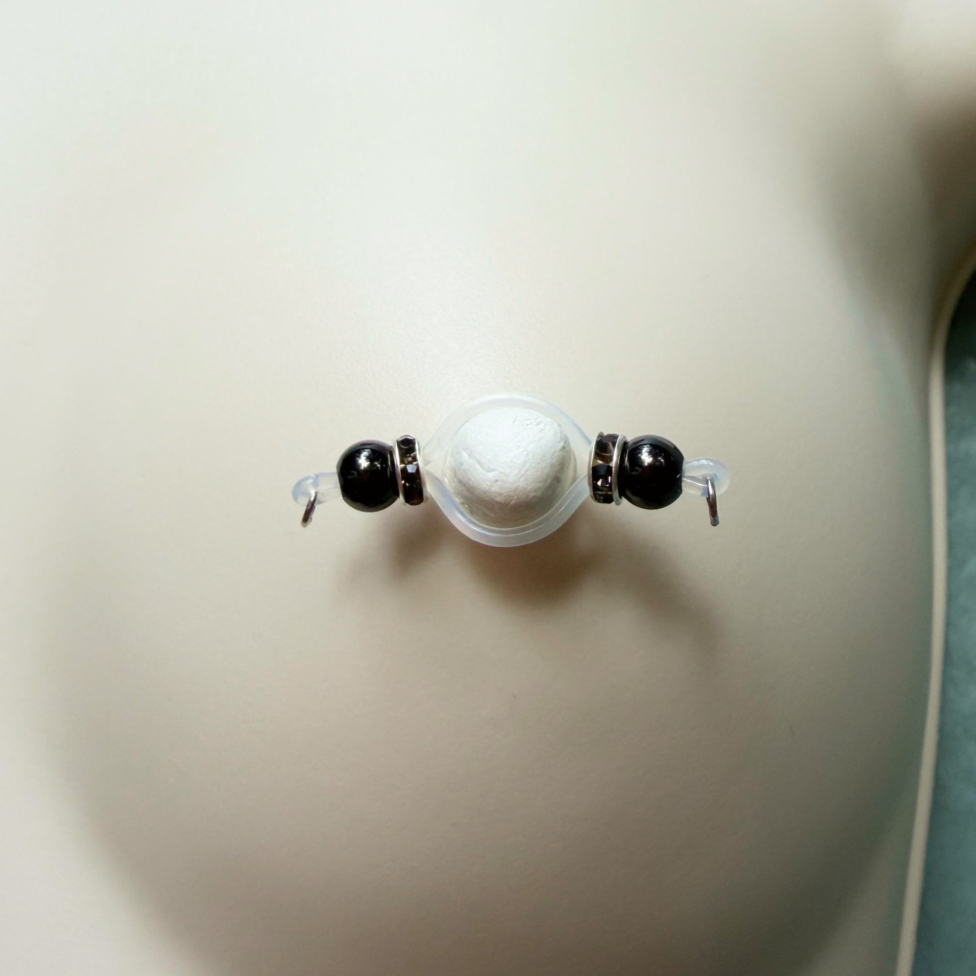 A classic pair of barbell style fake nipple piercings with black beads and roundel.