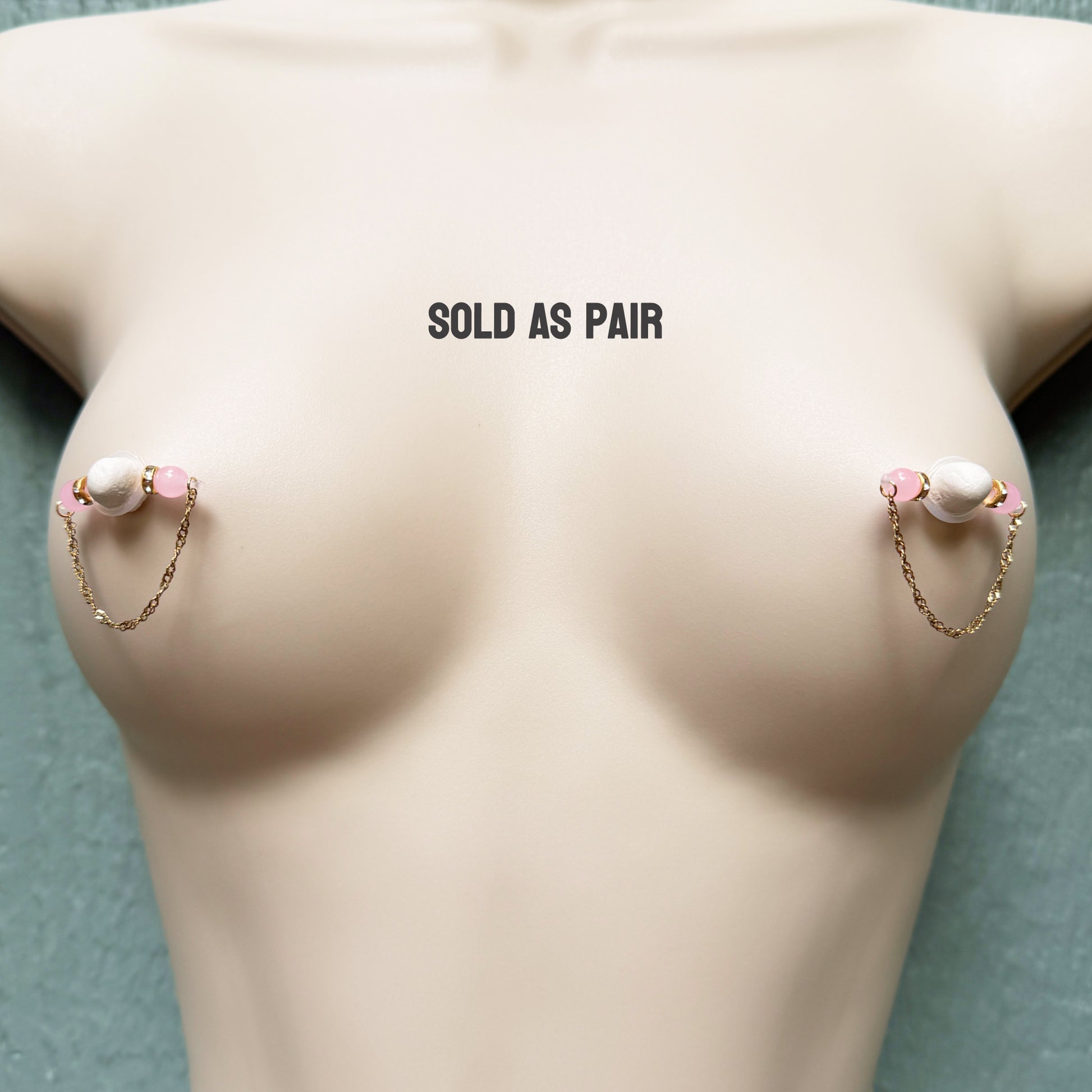 A pair of classic fake nipple piercing featuring shiny smooth glass beads in pink or blue (or a custom color) - with sparkly roundels and an elegant twist chain.