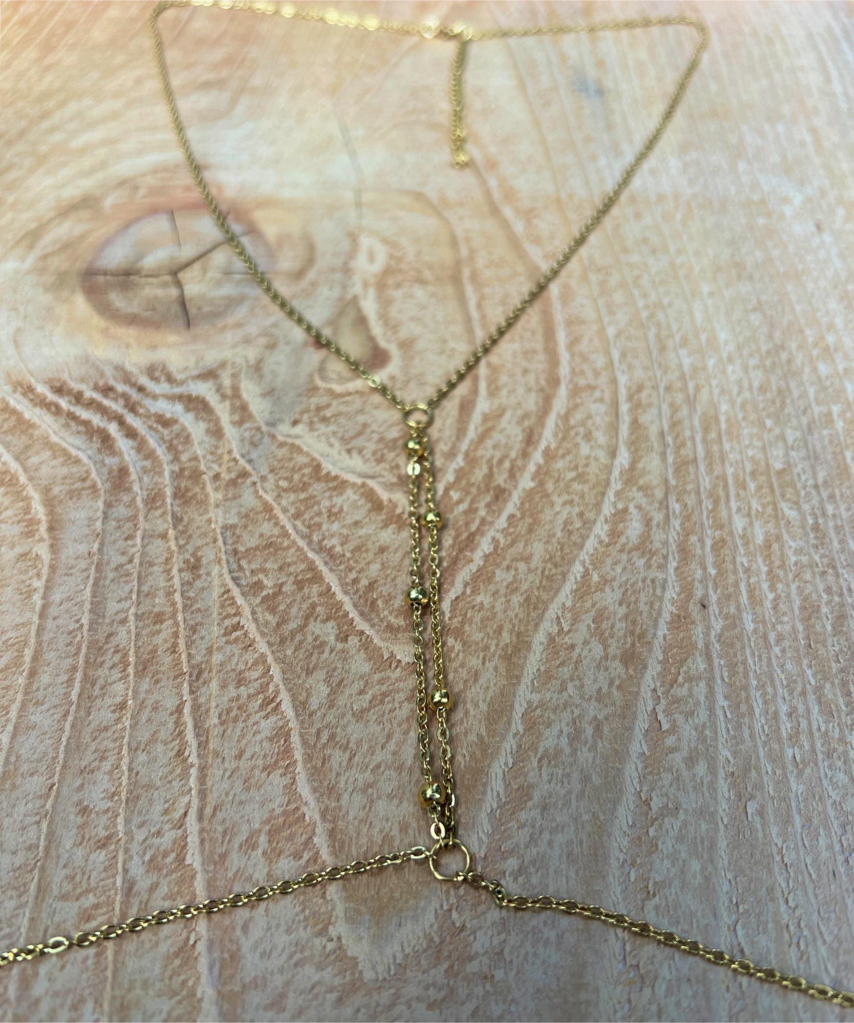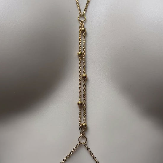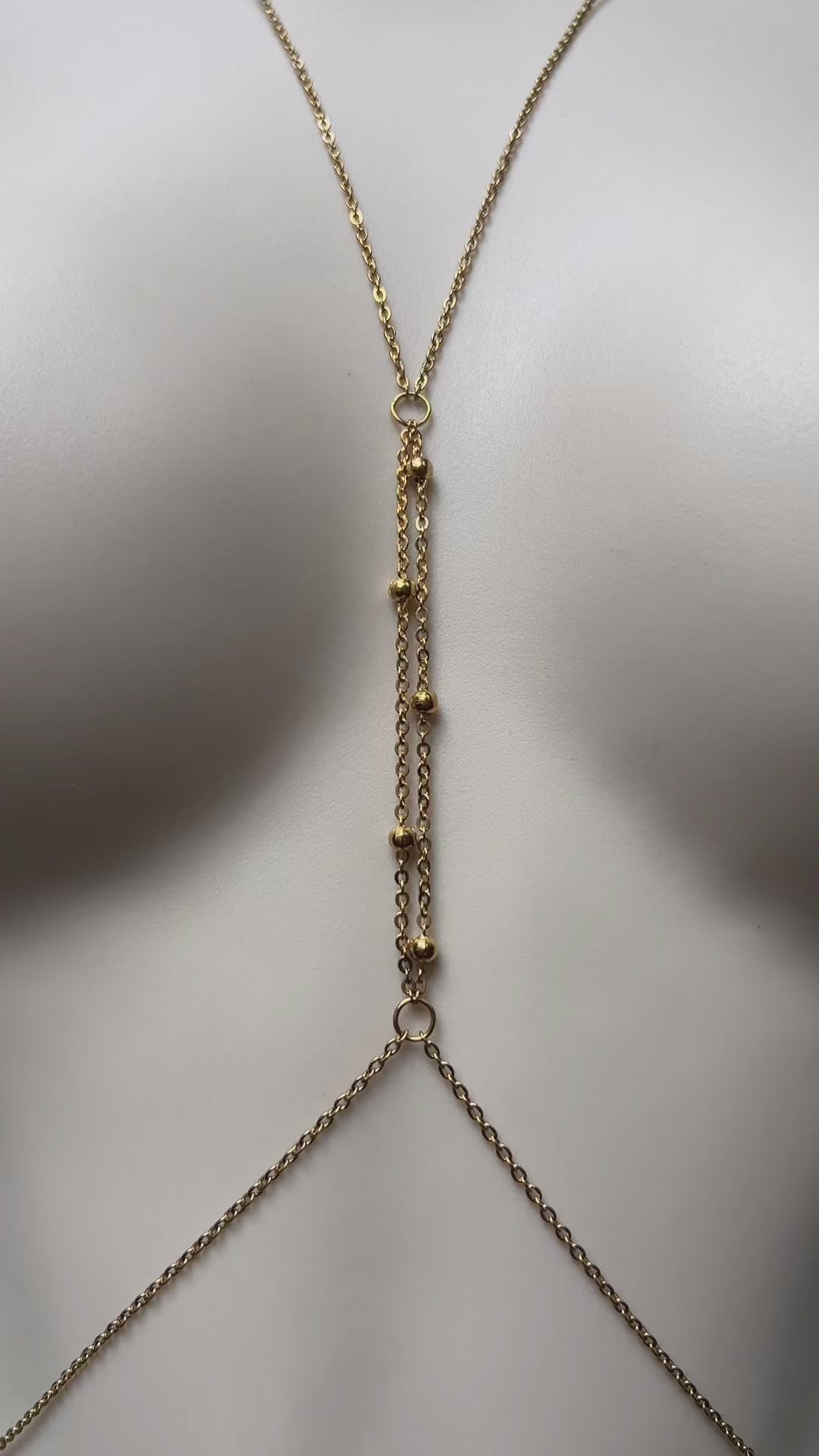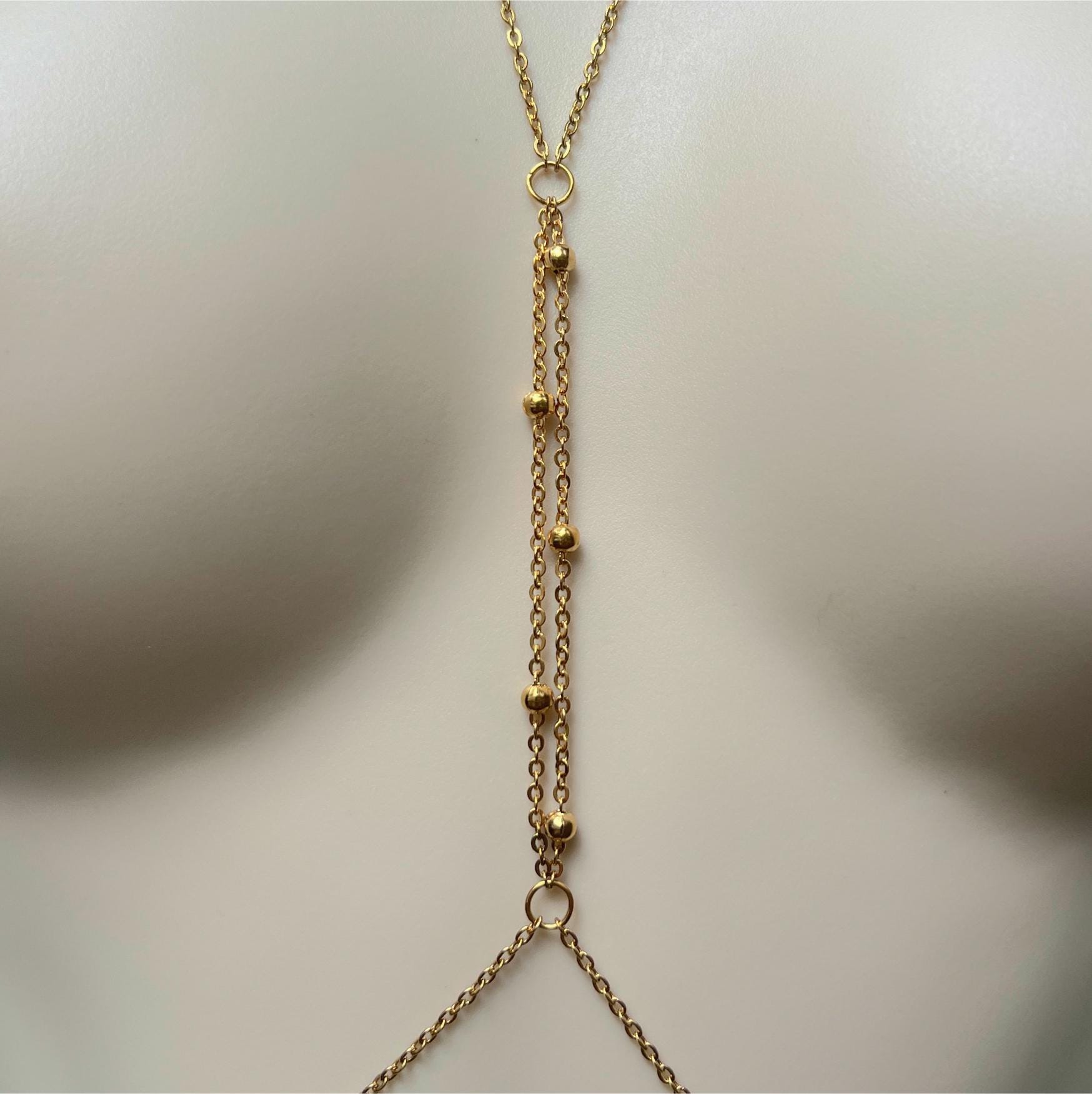 Beautiful and dainty body chain bralette featuring stainless steel chain and 18k gold plated beads in the center.
