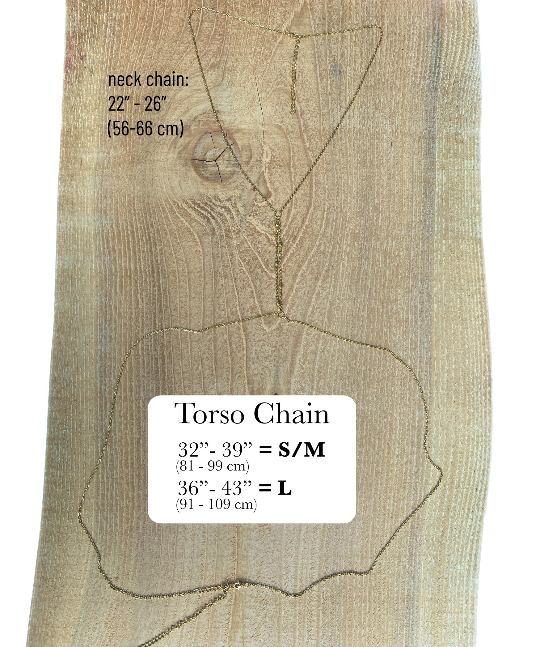 The neck chain is 22"-26", the torso chain comes in three lengths and sizes. Please measure your torso circumference before ordering.