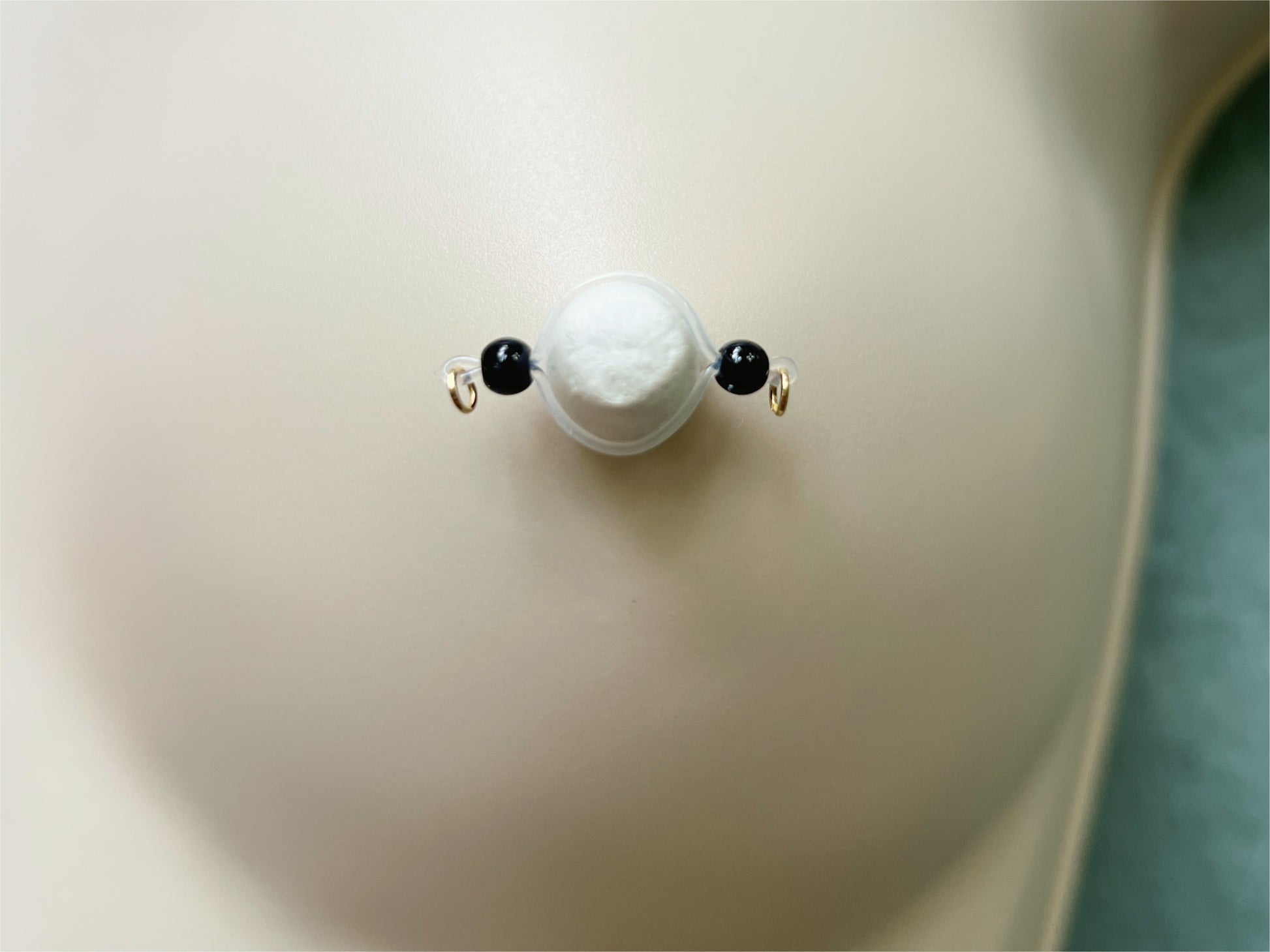 This faux nipple piercing stays on securely due to the elastic silicone noose. I do offer them in white and black, as well as in different sizes. Medium should work for most, but please refer to the "Nipple Size Guide" in the photos for details.