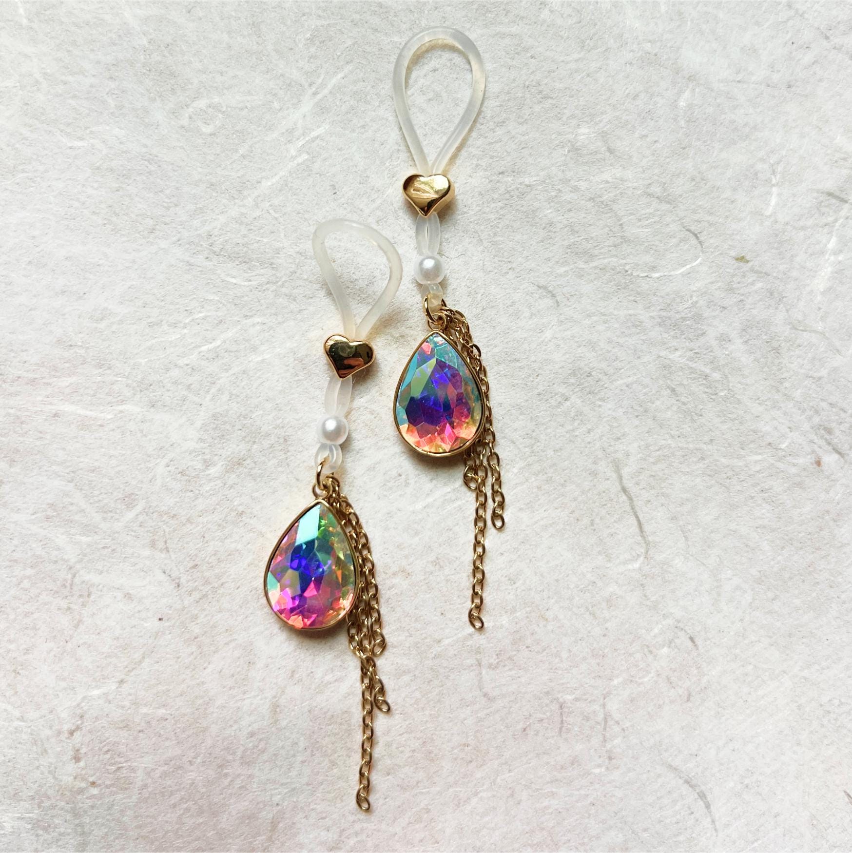 Cute fake nipple noose piercing featuring hearts, pearls, shiny rhinestones and chains, OH MY!