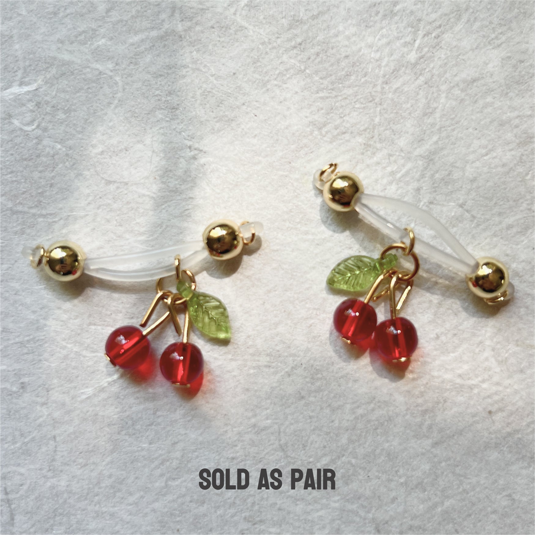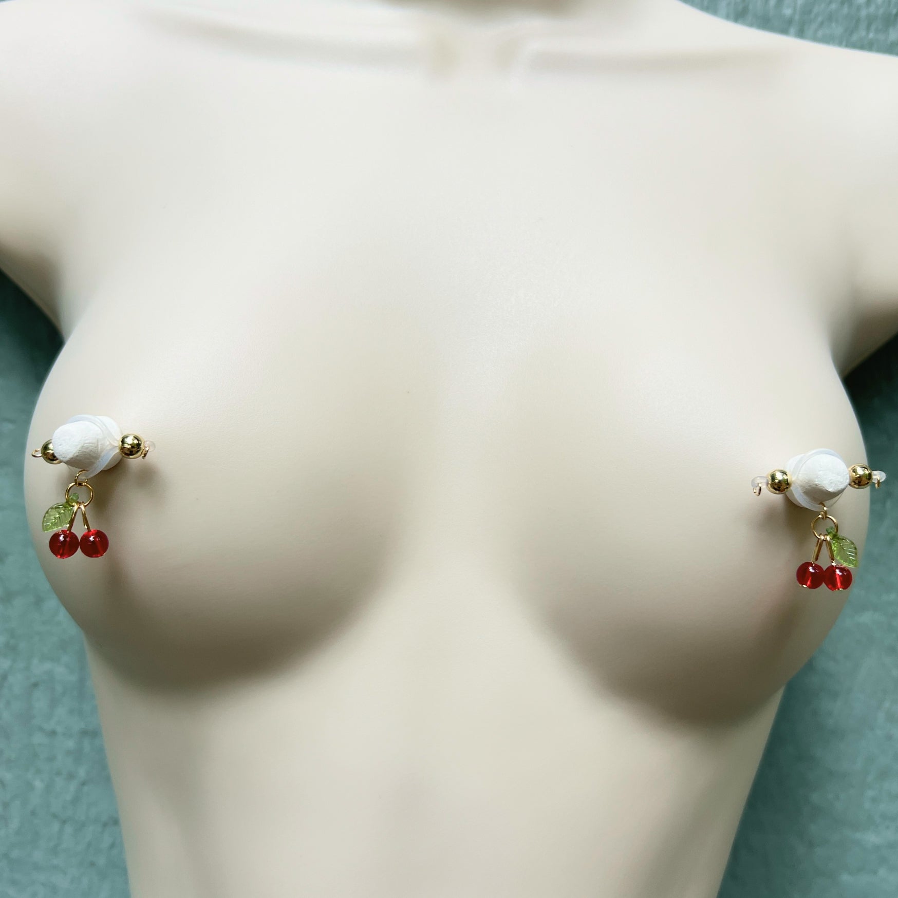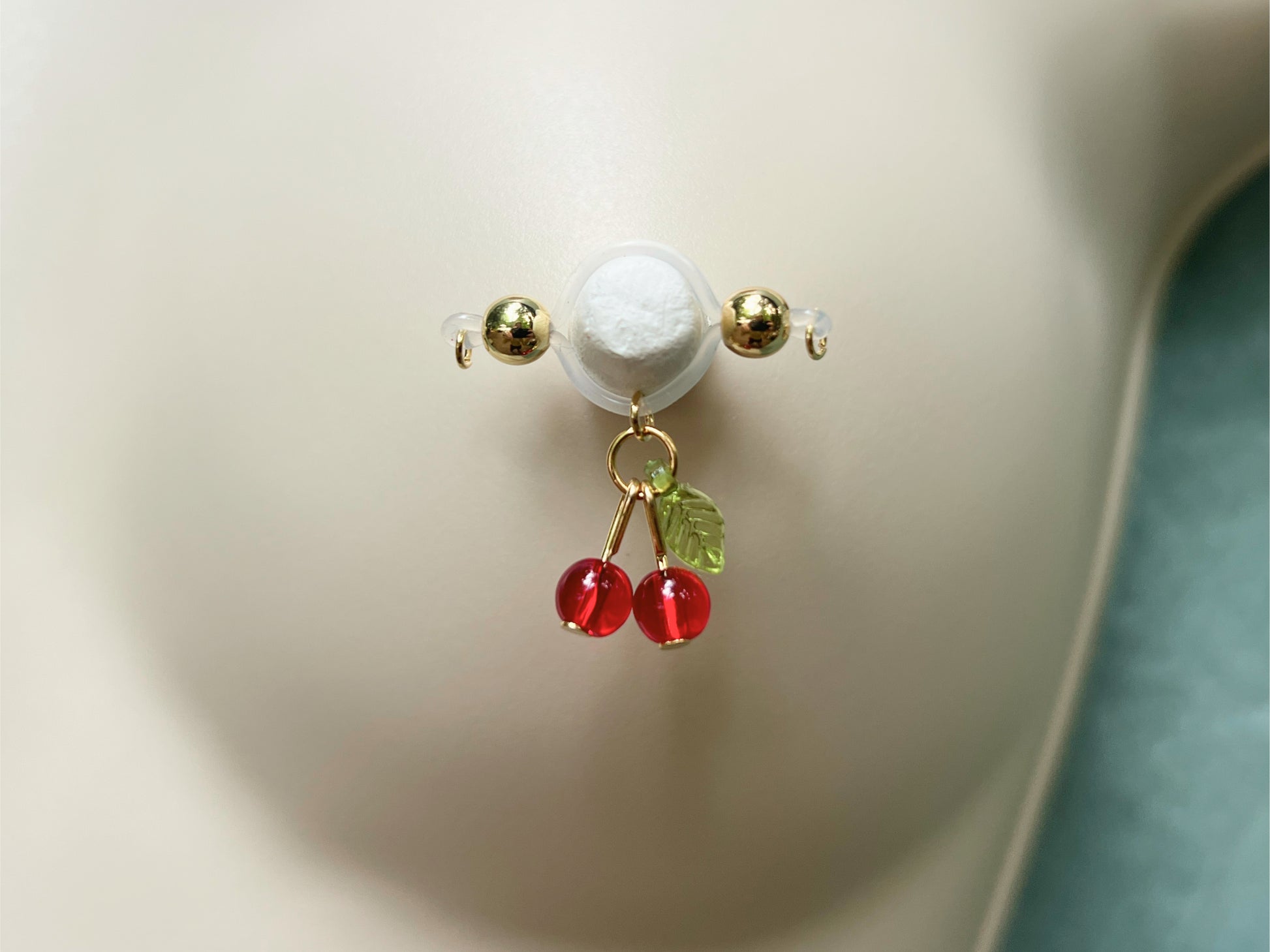 These dangling tiny cherry charms are THE CUTEST in the Secretly Mine shop! Late summer vibes can be any time with these dainty cherry charms on barbell style fake nipple piercings. No piercing needed!