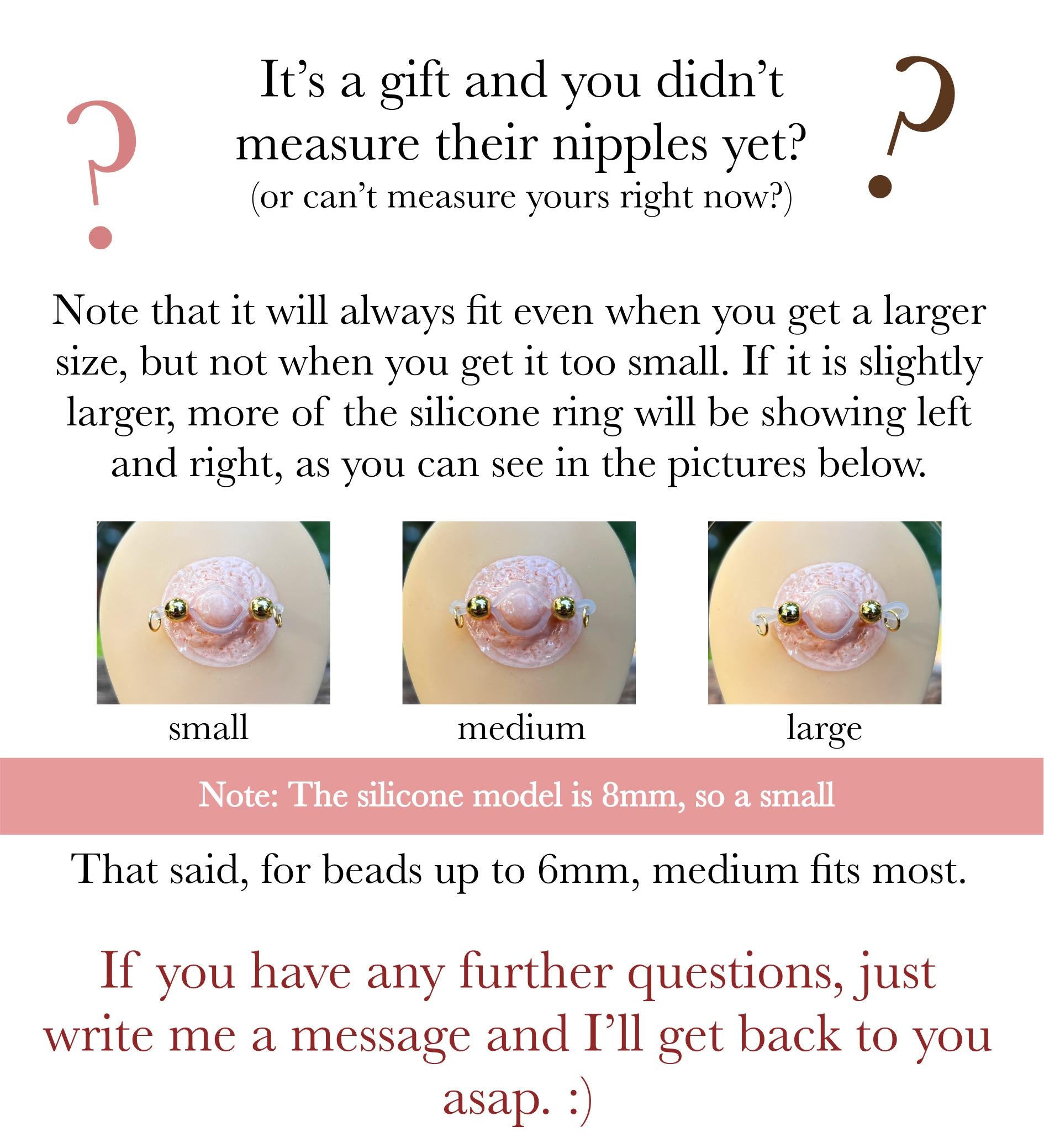 This faux nipple piercing stays on securely due to the elastic silicone noose. I do offer them in white and black, as well as in different sizes. Medium should work for most, but please refer to the "Nipple Size Guide" in the photos for details.