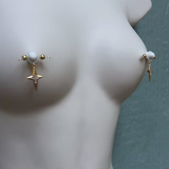 A pair of non-piercing nipple jewelry (barbell style) with cute and bold 4 pointed star charms - by Secretly Mine.