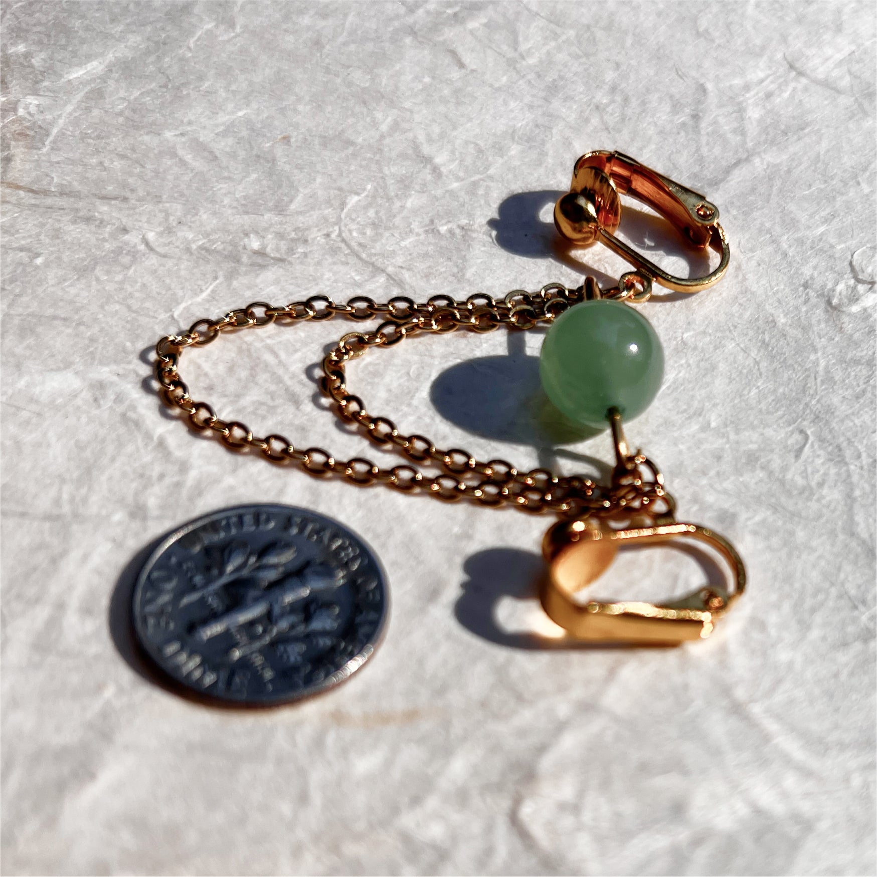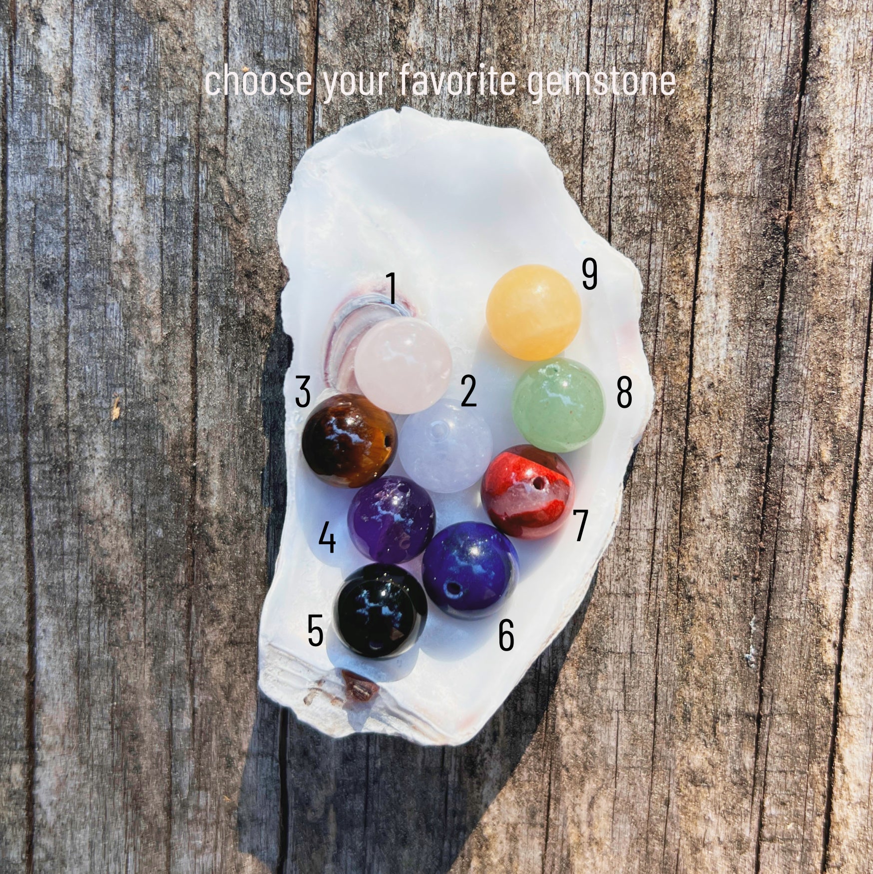 A natural and freely spinning gemstone (pick your favorite one!) will then sit right on your pearl and get things going, while the two chains will daintily dangle when in motion. :)