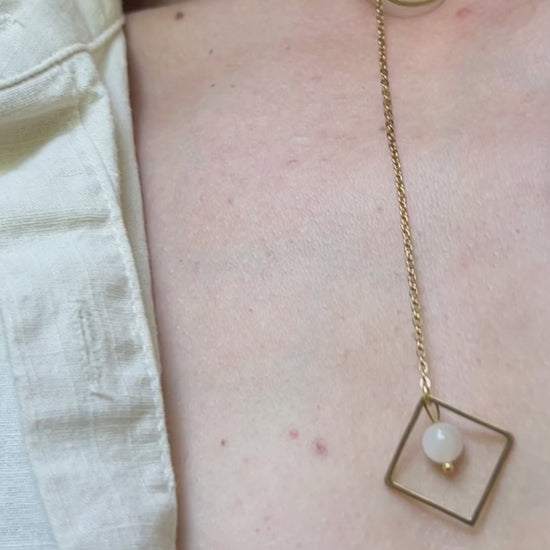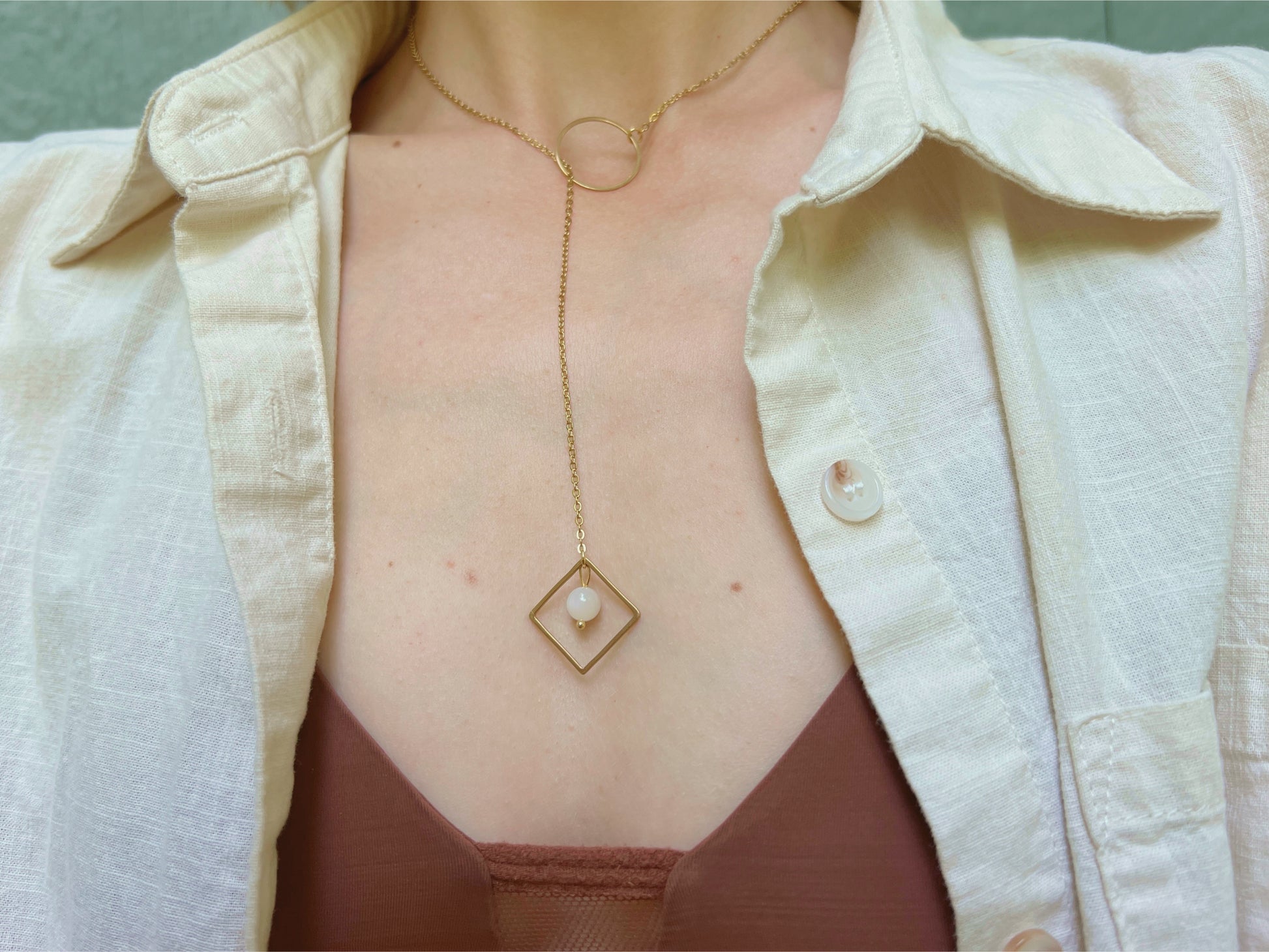 A striking yet subtle lariat-style day collar designed for the modern submissive. This elegant Secretly Mine piece features a minimalist O-ring at the top and a diamond drop at the base, symbolizing quiet devotion and connection. Suspended from the diamond is your choice of moonstone, pearl, or carnelian—each stone adding its own energy and meaning. Crafted for everyday wear, this discreet collar blends BDSM symbolism with refined, wearable style.