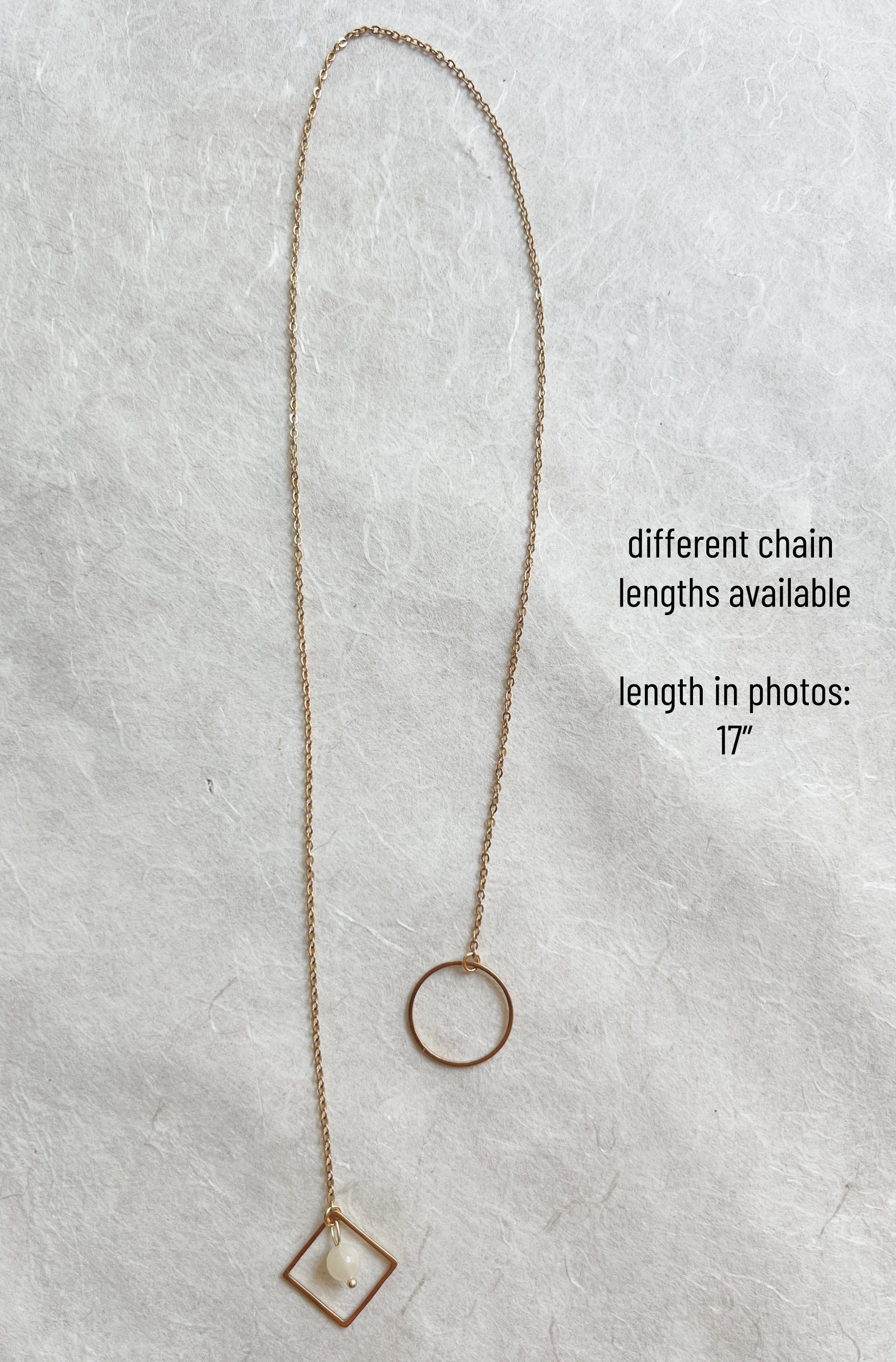Comes in different lengths, from 14"-24". The model in the photo is wearing a 17" chain. Due to the nature of this necklace the length is not adjustable, but the style makes it suitable for different neck sizes.