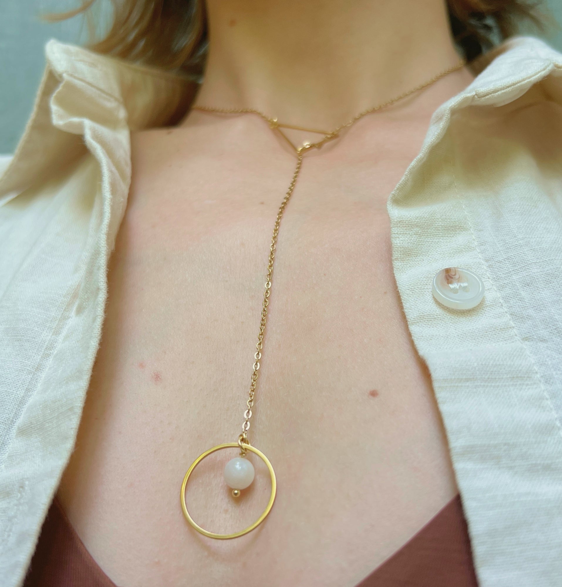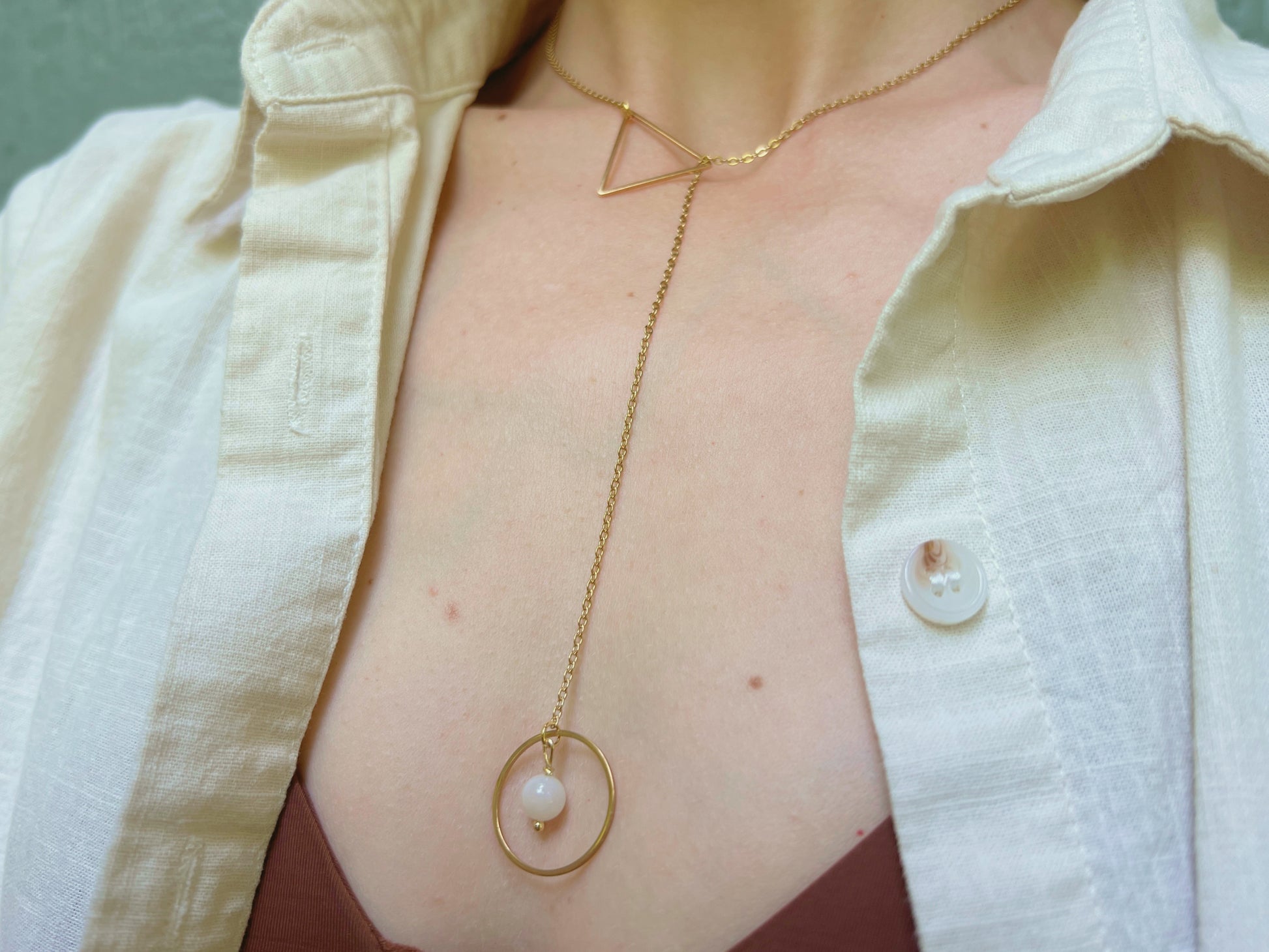 A striking yet subtle lariat-style day collar designed for the modern submissive. This elegant Secretly Mine piece features a minimalist triangle at the top and a O-ring drop at the base, symbolizing quiet devotion and connection. Suspended from the O-ring is your choice of moonstone, pearl, or carnelian—each stone adding its own energy and meaning. Crafted for everyday wear, this discreet collar blends BDSM symbolism with refined, wearable style.