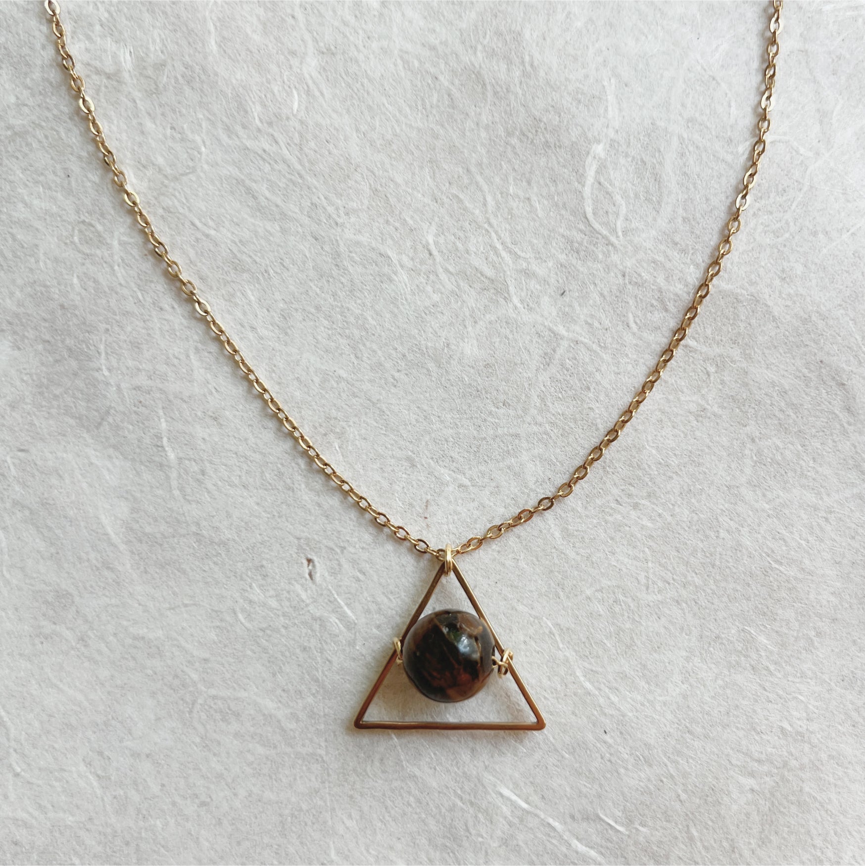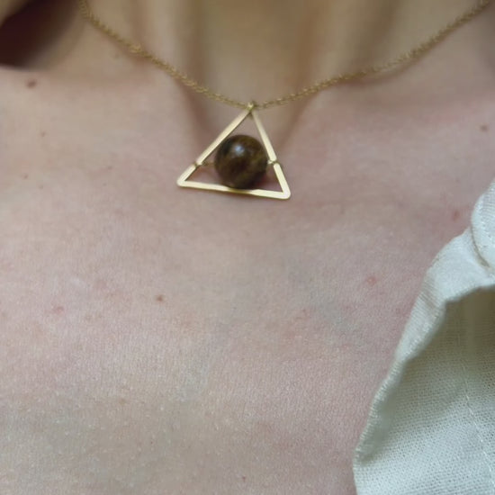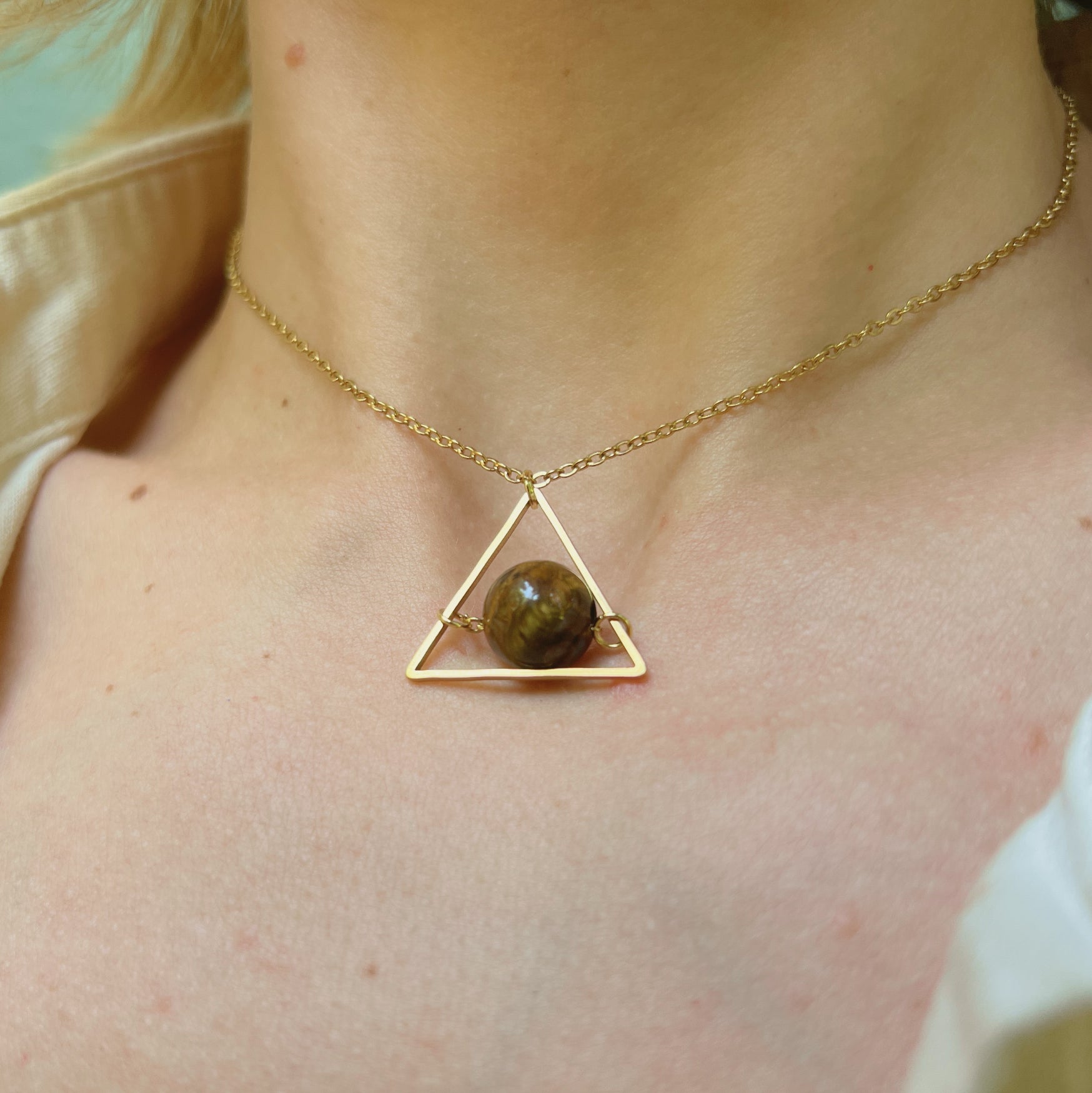 An elegant and dainty tigers eye necklace with modern triangle pendant by Secretly Mine. Made with non tarnish PVD gold plated stainless steel chain and pendant, and a 10mm shimmery yellow tigers eye bead. Simple, elegant and high quality. It is also available in pure stainless steel.