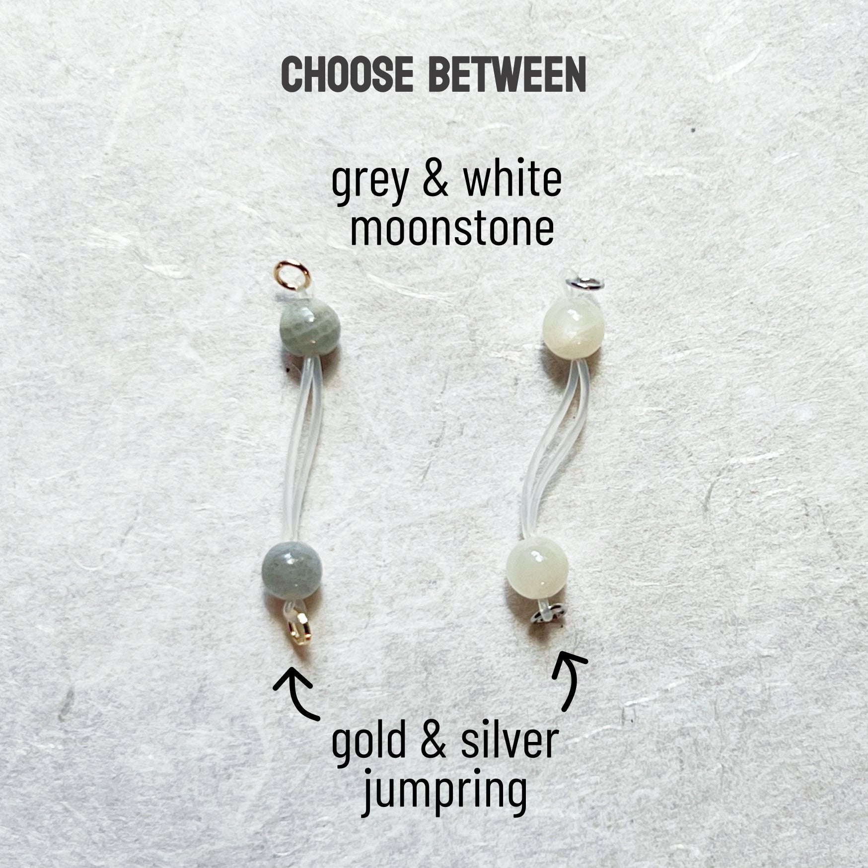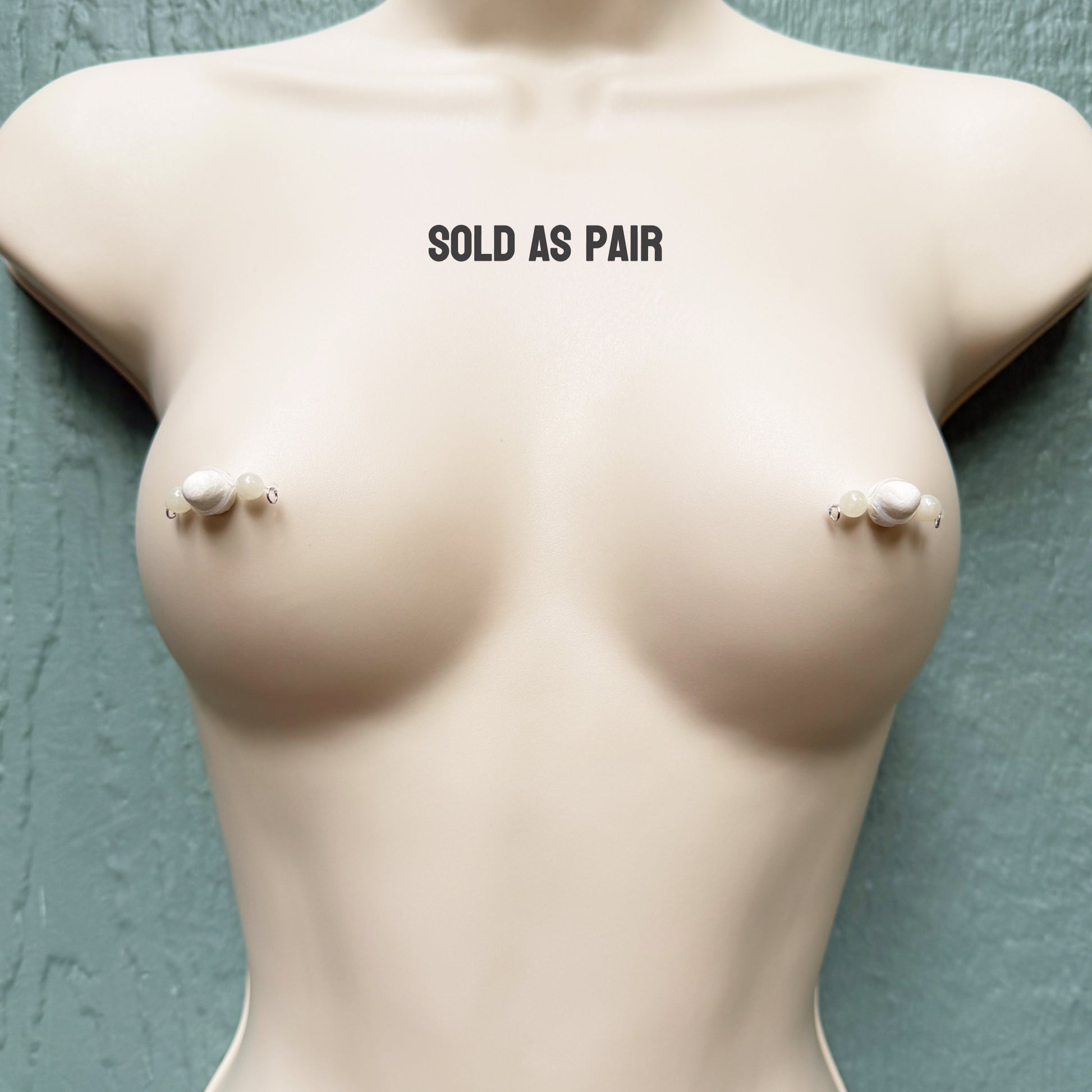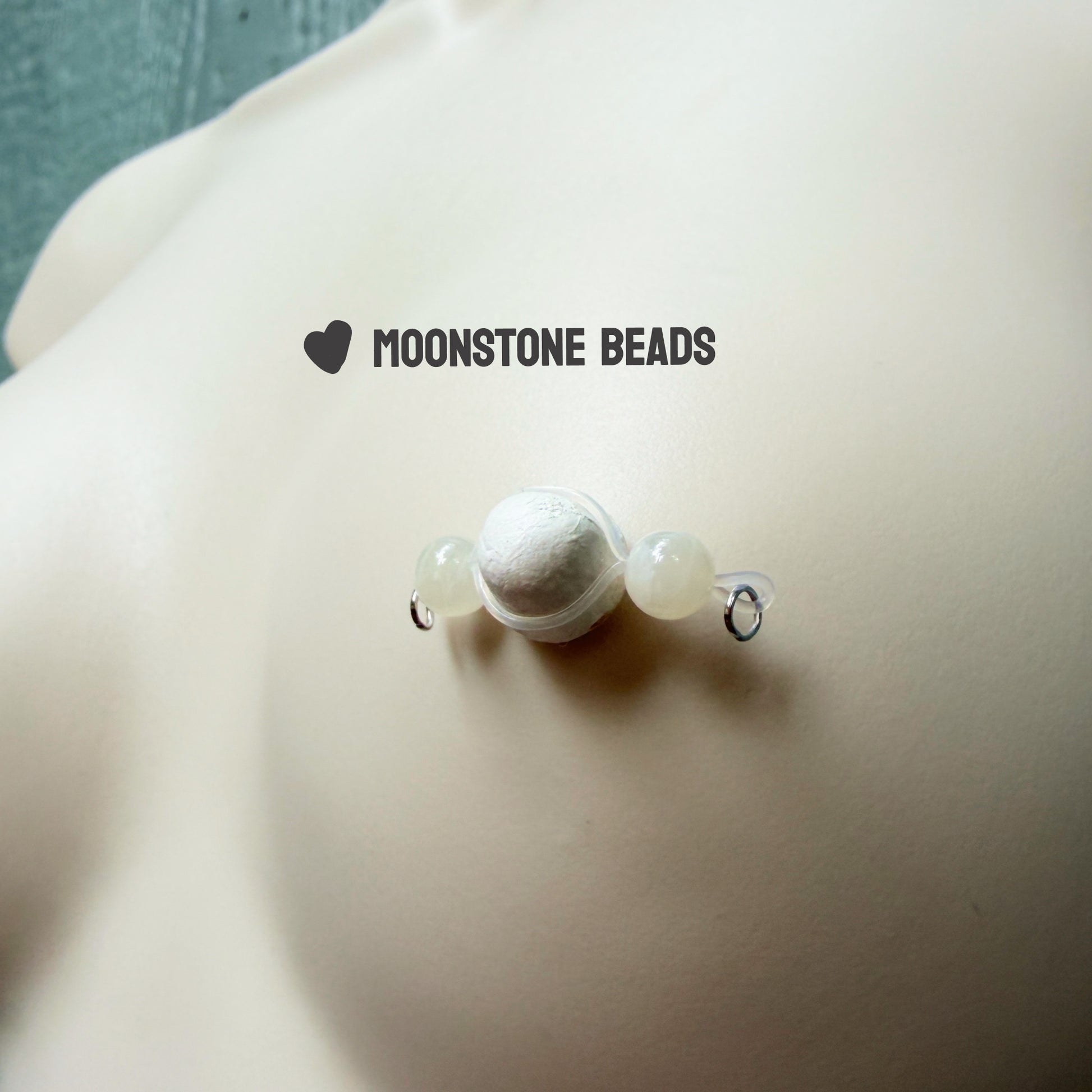 Real white and grey moonstones adorn this pair of non pierced nipple jewelry - a match made in heaven!