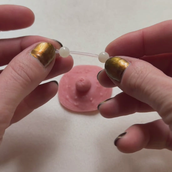 This faux nipple piercing stays on securely due to the elastic silicone noose. I do offer them in white and black, as well as in different sizes. Medium should work for most, but please refer to the "Nipple Size Guide" in the photos for details.