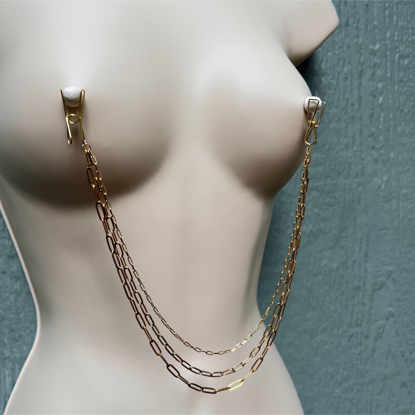 Nipple Clamps with Chains - Triple Nipple Chain Connector / Body Chain to Nipple Jewelry
