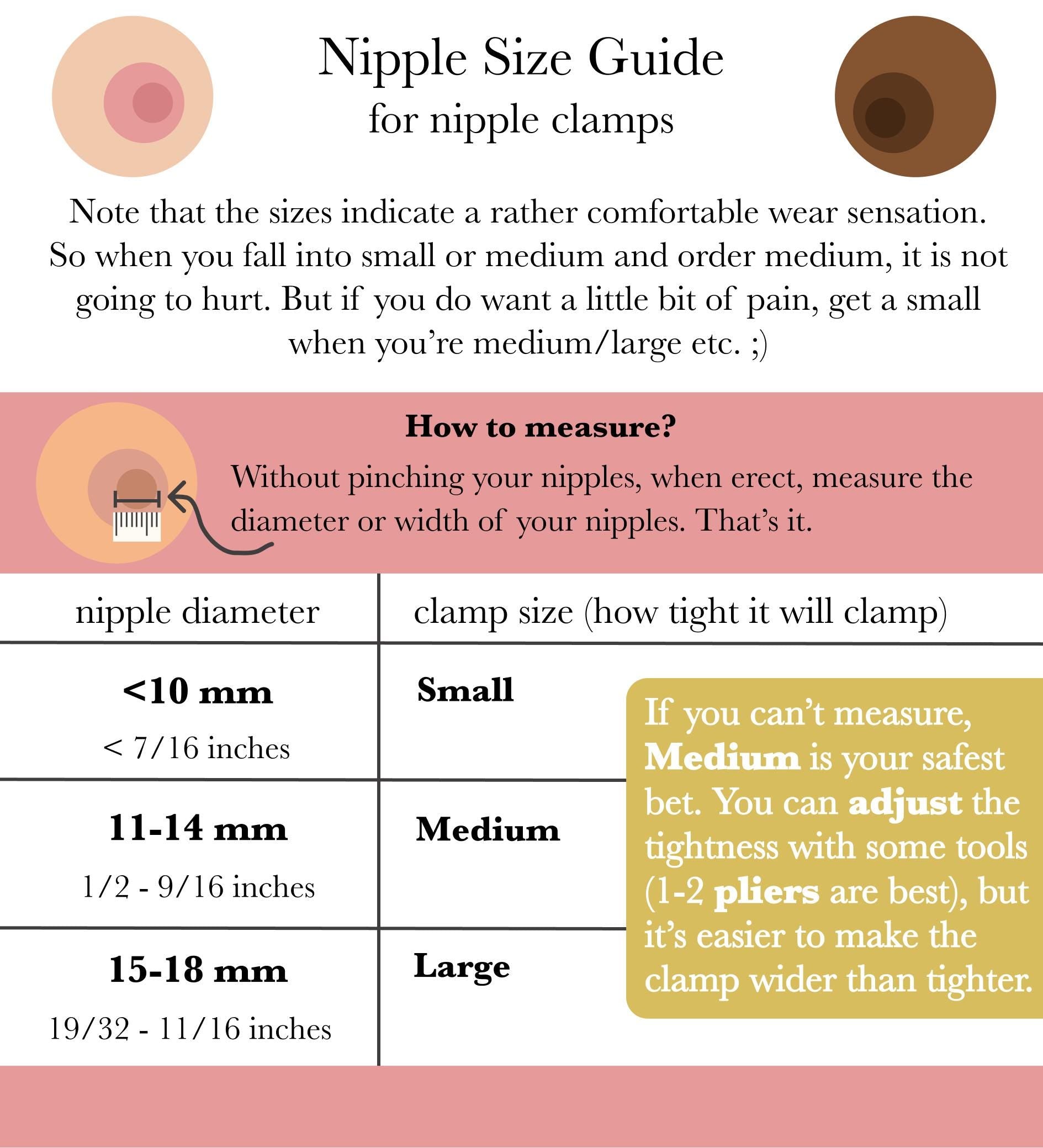 The clamps can be adjusted with some tools (1-2 pliers are best) and made wider or tighter, depending on your nipple size and pain tolerance. It is easier to make them wider however.