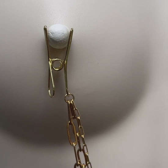 Super sexy and dainty nipple clamp that is connected to a nipple chain, connecting left and right with three paperclip chains. Your new piece of bdsm jewelry is right here.