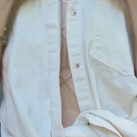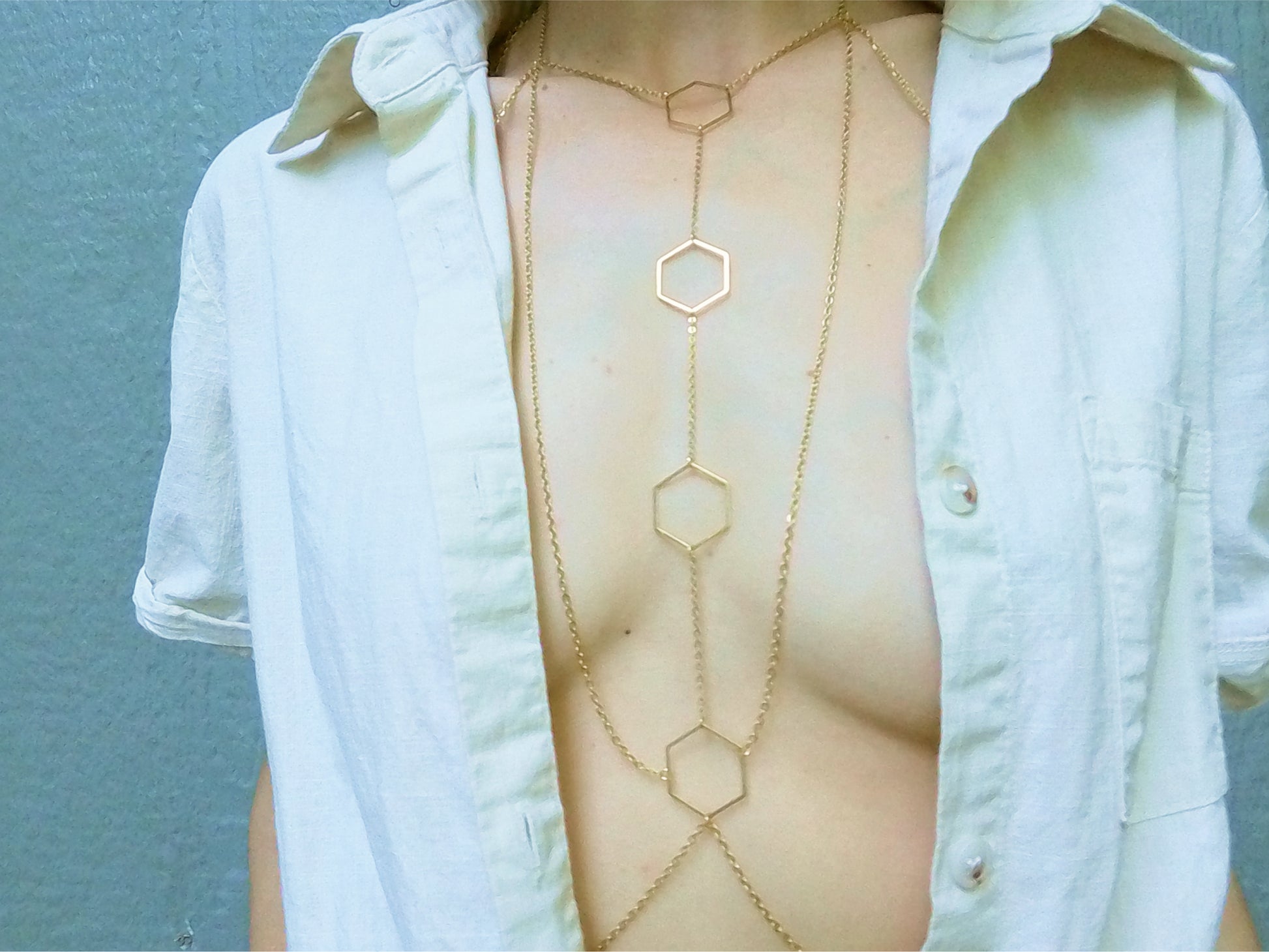Dainty boho body chain bra featuring tarnish resistant stainless steel chain and little but sturdy polygons. Also available in silver aka pure stainless steel, by Secretly Mine.