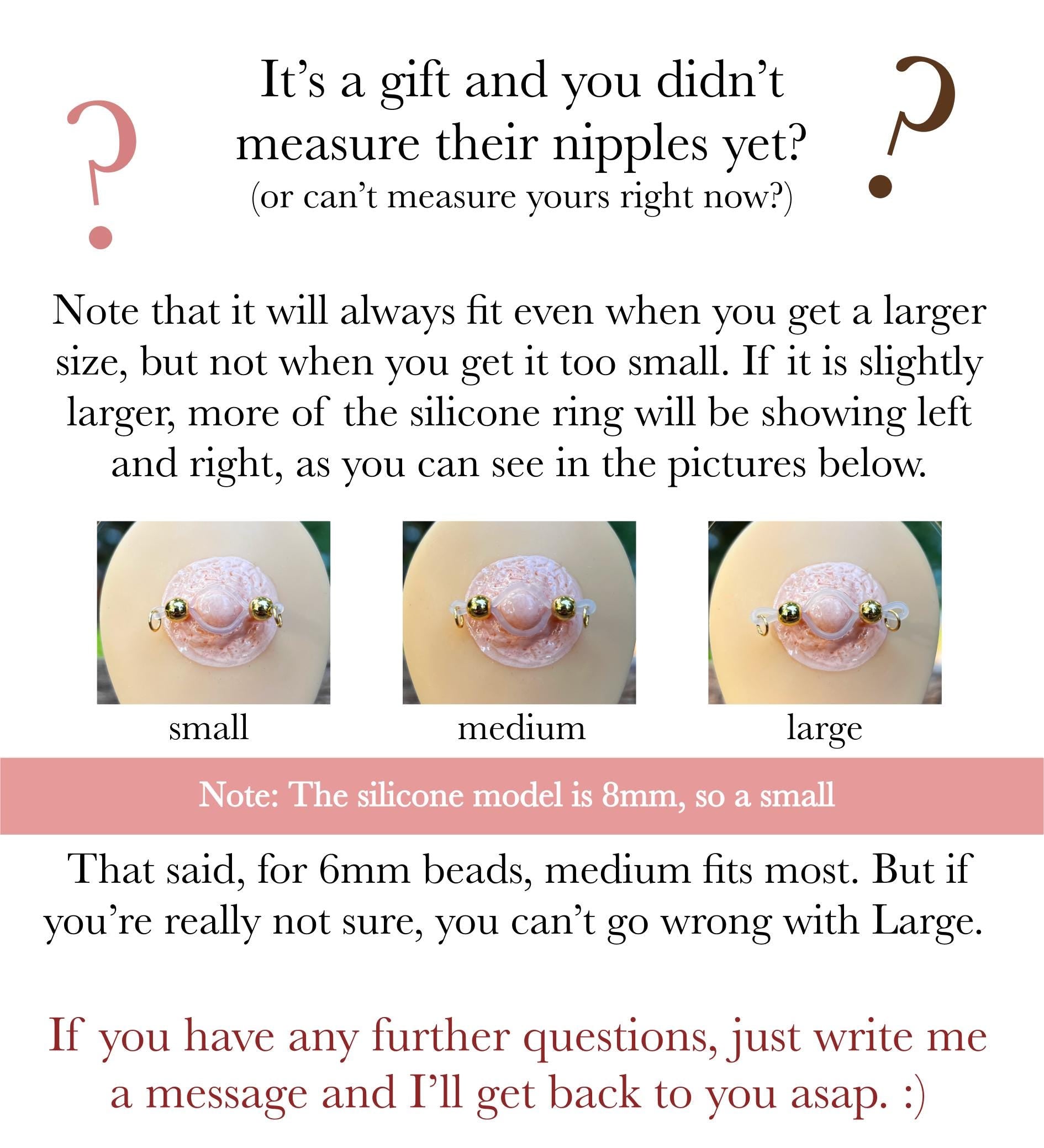 Non pierced nipple jewelry with stainless steel chains & beads. Fully adjustable and it stays on as long as you want. The classic industrial piercing aesthetic, but elevated. :) A pair of faux nipple piercings featuring shiny and never fading 6mm stainless steel beads and stainless steel chains in different lengths.