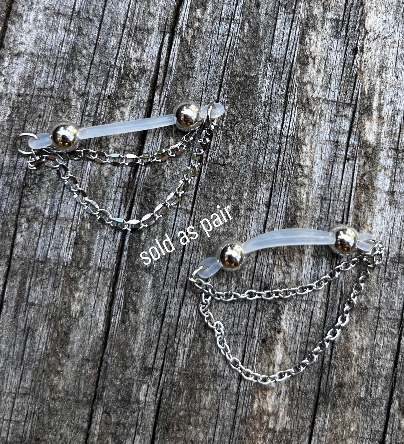 Silver Barbell Nipple Chain Piercing - Fake Nipple Piercing / Clip On Nipple Rings