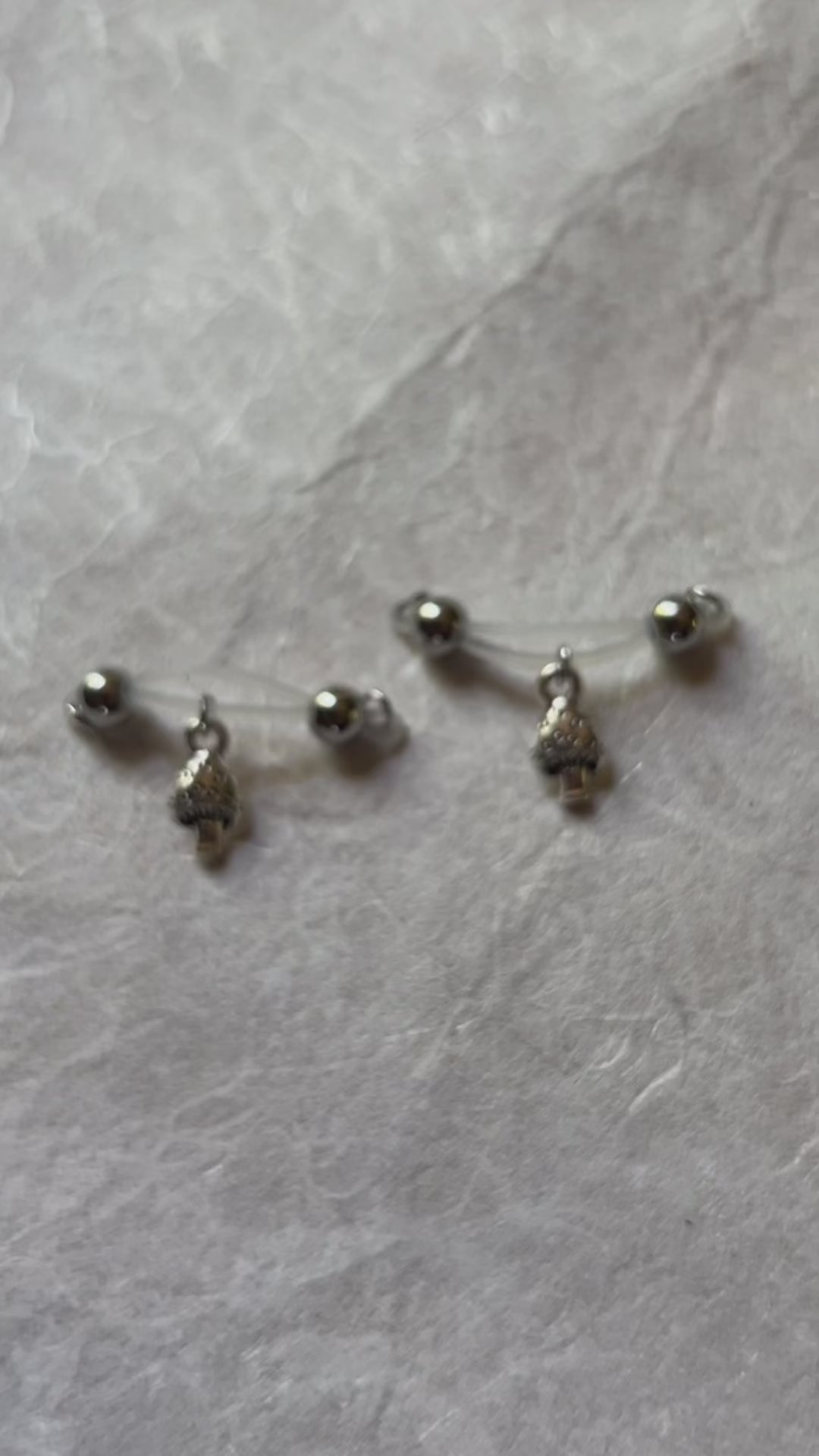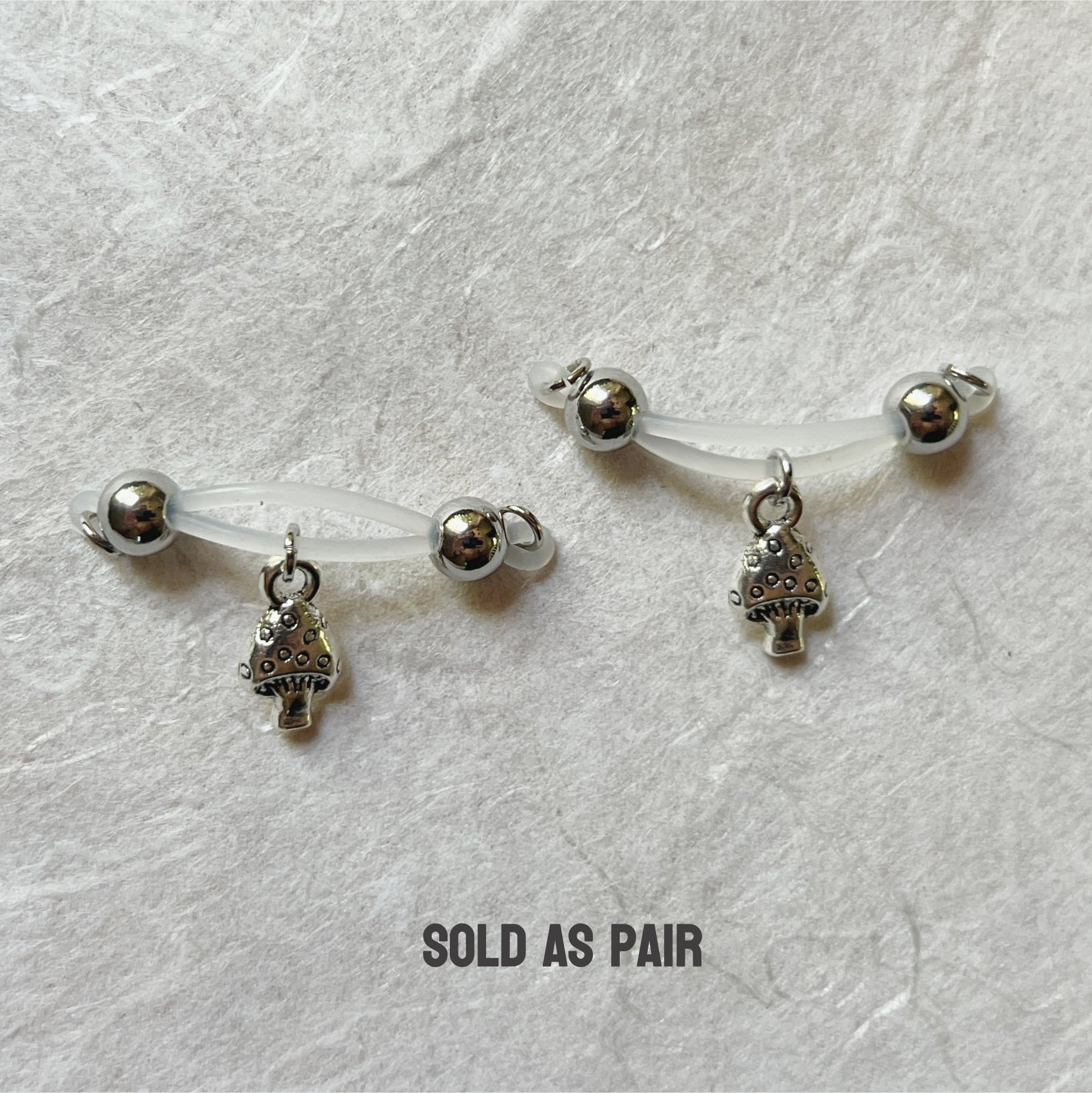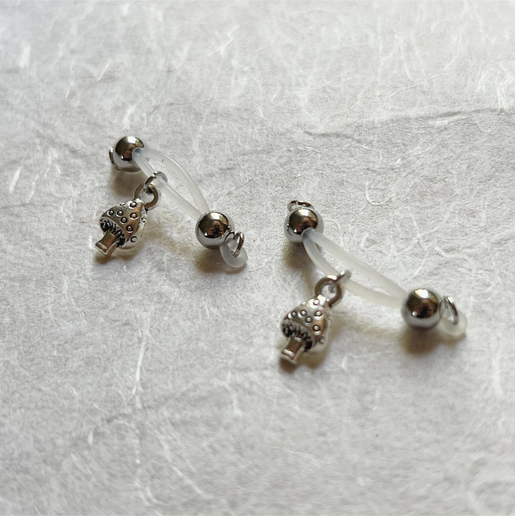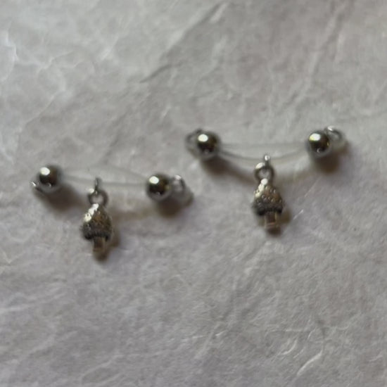 Mushroom season can be any time with these super cute and dainty mushroom charms dangling on barbell style fake nipple piercings by Secretly Mine. No piercing needed!