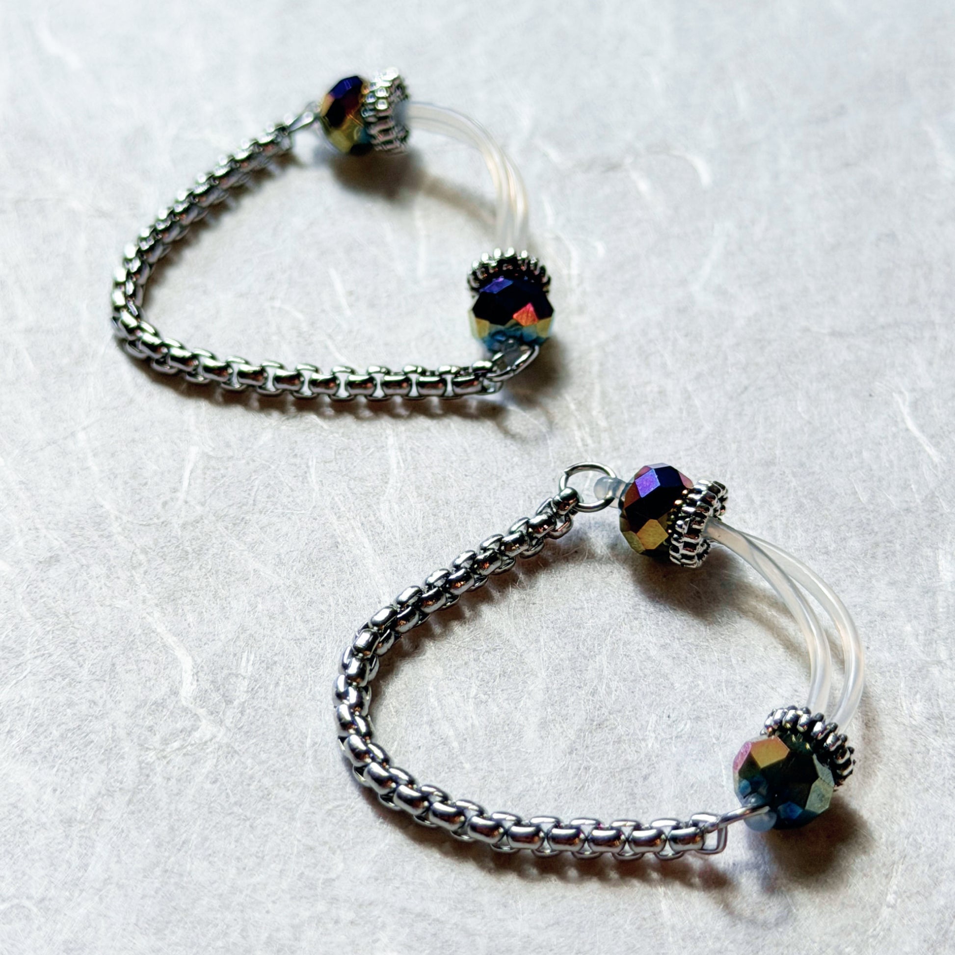 The sparkle with these glass beads is just stunning. Adorned with shiny stainless steel roundels and a bold snake chain.