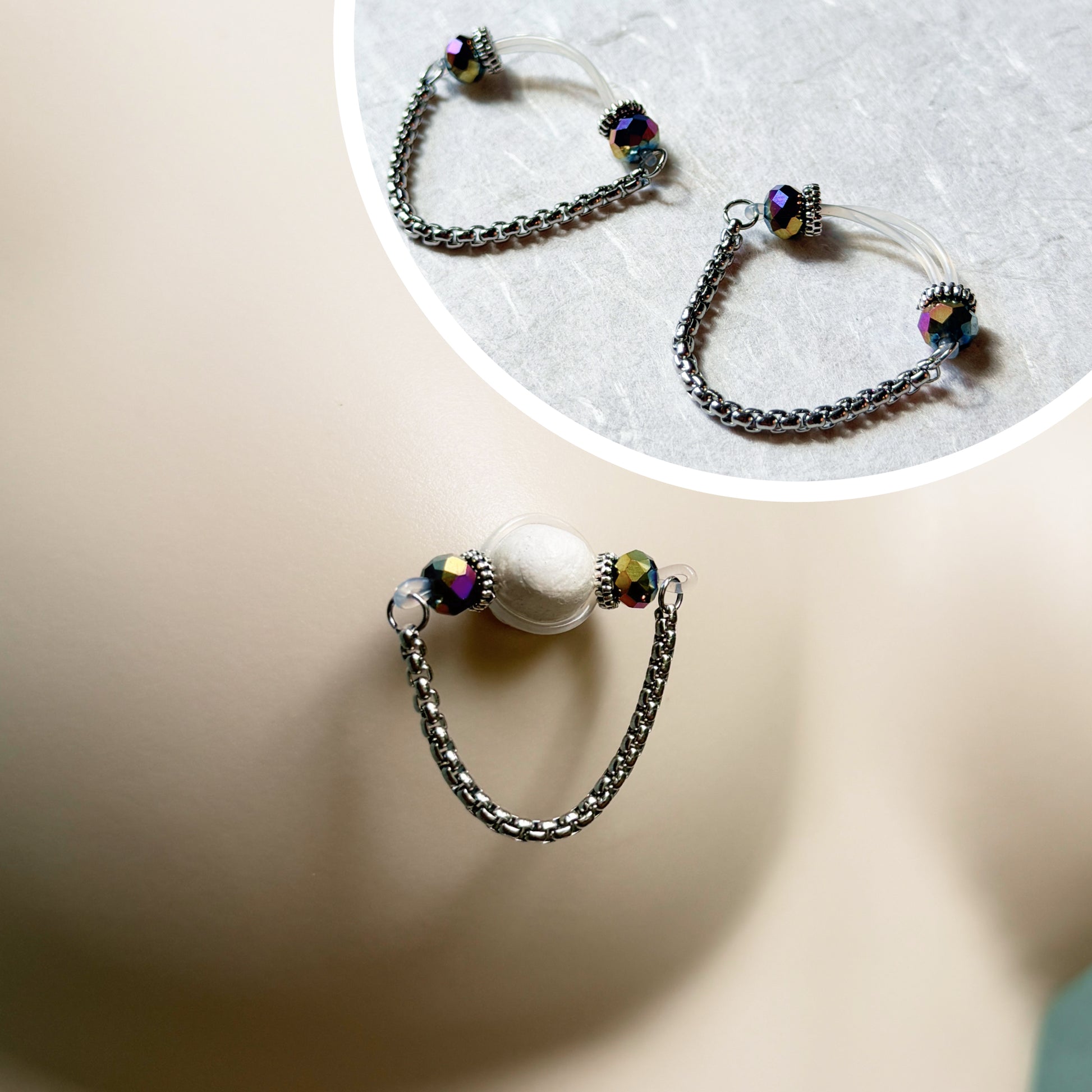 Sparkly Nipple Jewelry with Snake Chain - Fake Nipple Piercing / Nipple Rings