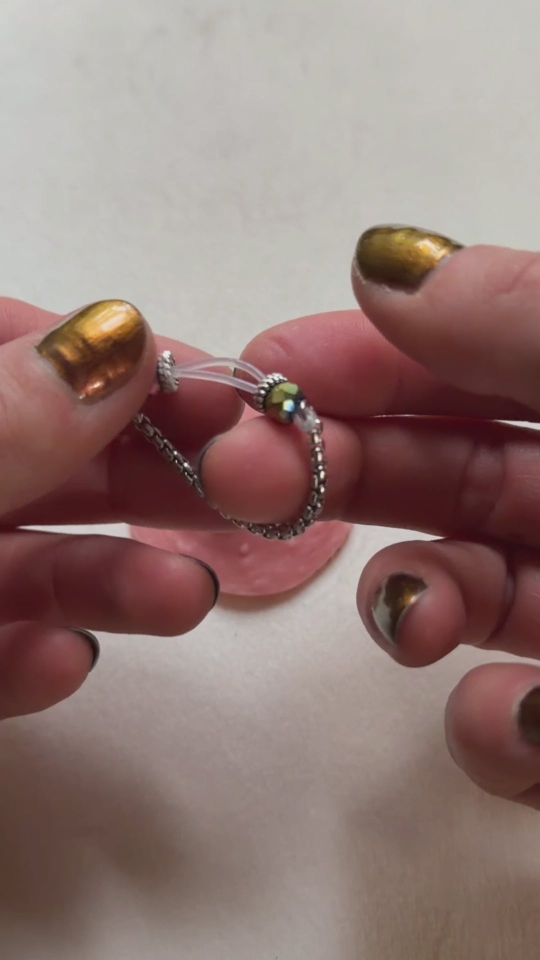 It will stay on securely due to the elastic silicone noose. The beads are 5-6mm big, the roundel and chain are made of tarnish resistant stainless steel. *NOT AVAILABLE IN THE EU*