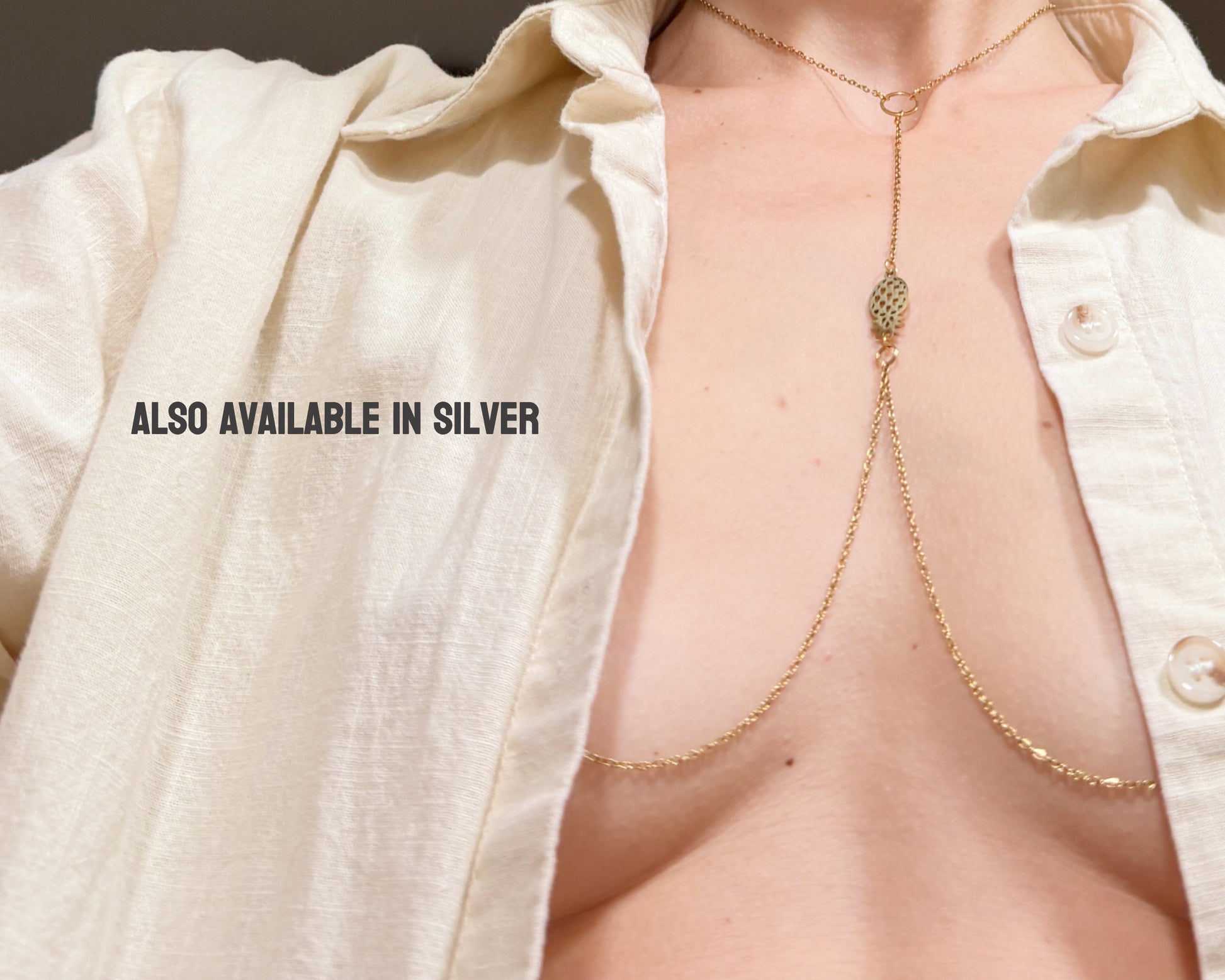 Nipple Chain: The actual nipple chain comes in 4 lengths. So depending on the torso length and especially the cup size, please try to measure and order accordingly. The model in the photos is wearing XS with a A-B cup.